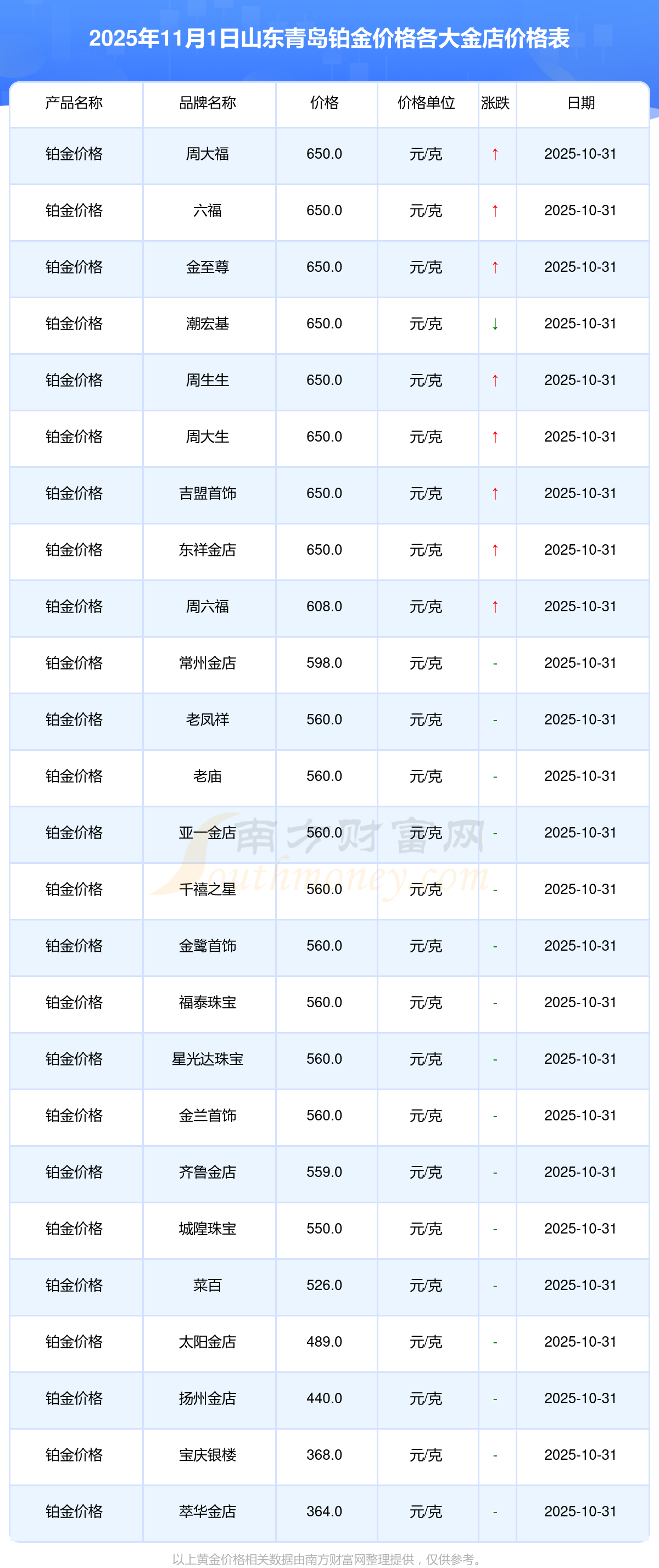 2025年11月1日山东青岛周大福、周大福、周大福、周大福、周大福、周大福、周大福、老凤祥、老凤祥、老凤祥、周六福等各大金店品牌铂金价格最新价格如下:周大福黄金价格1198.0元/克,周大福铂金价格650.0元/克,周大福饰品金价(内地)1198.0元/克,周大福黄金饰品(香港)44660.0,周大福铂金价格(香港)18640.0,周大福金条价格(香港)40080.0,周大福金条金价(内地)1058.0元/克,老凤祥黄金价格1200.0元/克,老凤祥铂金价格560.0元/克,老凤祥足金价格1200.0元/克,周六福黄金价格1135.0元/克。