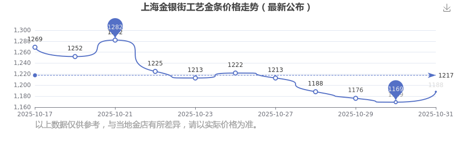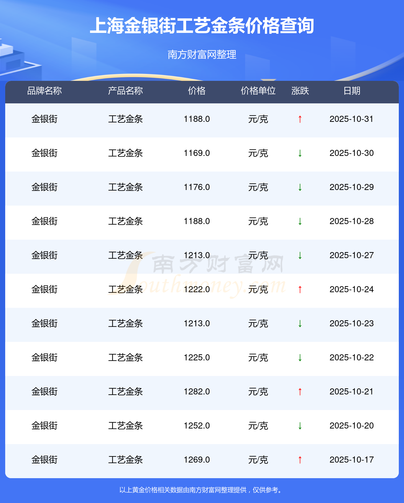 1188.0元/克,此乃上海金银街于 2025年11月1日工艺金条的挂牌价格。