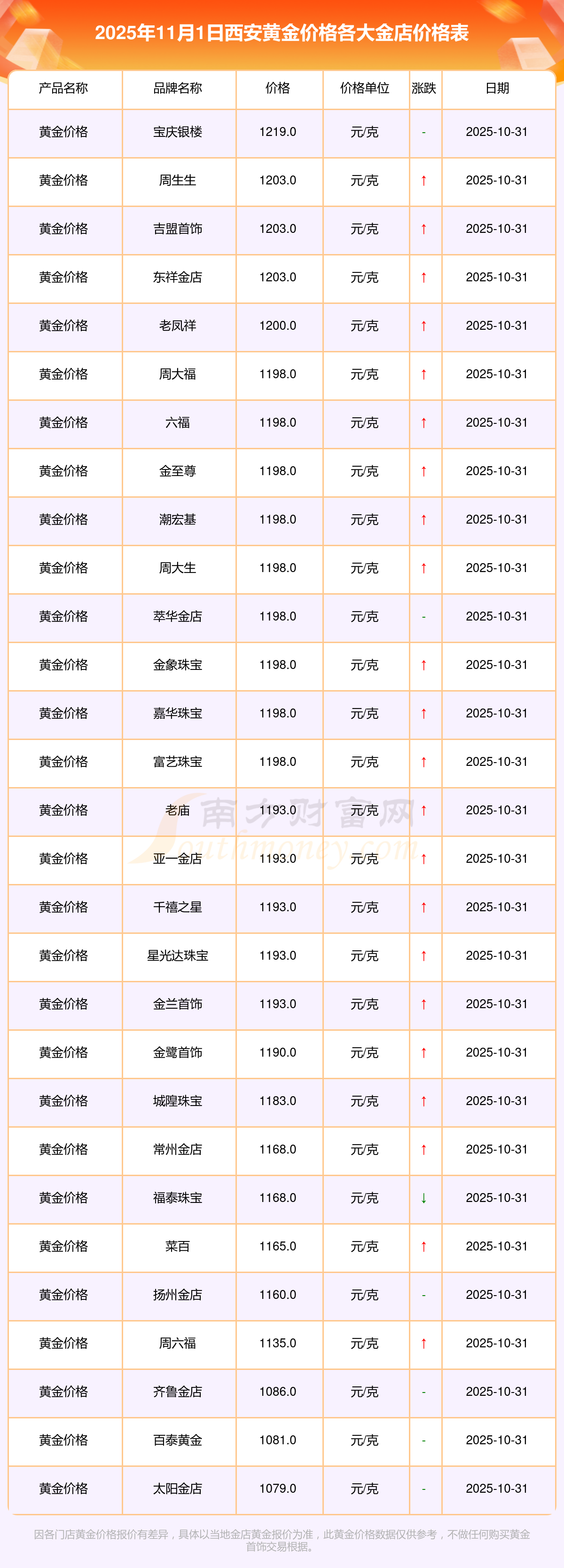 2025年11月1日西安各大金店黄金价格最新价格:周大福1198.0元/克,周大福650.0元/克,周大福1198.0元/克,周大福44660.0,周大福18640.0,周大福40080.0,周大福1058.0元/克,老凤祥1200.0元/克,老凤祥560.0元/克,老凤祥1200.0元/克,周六福1135.0元/克。