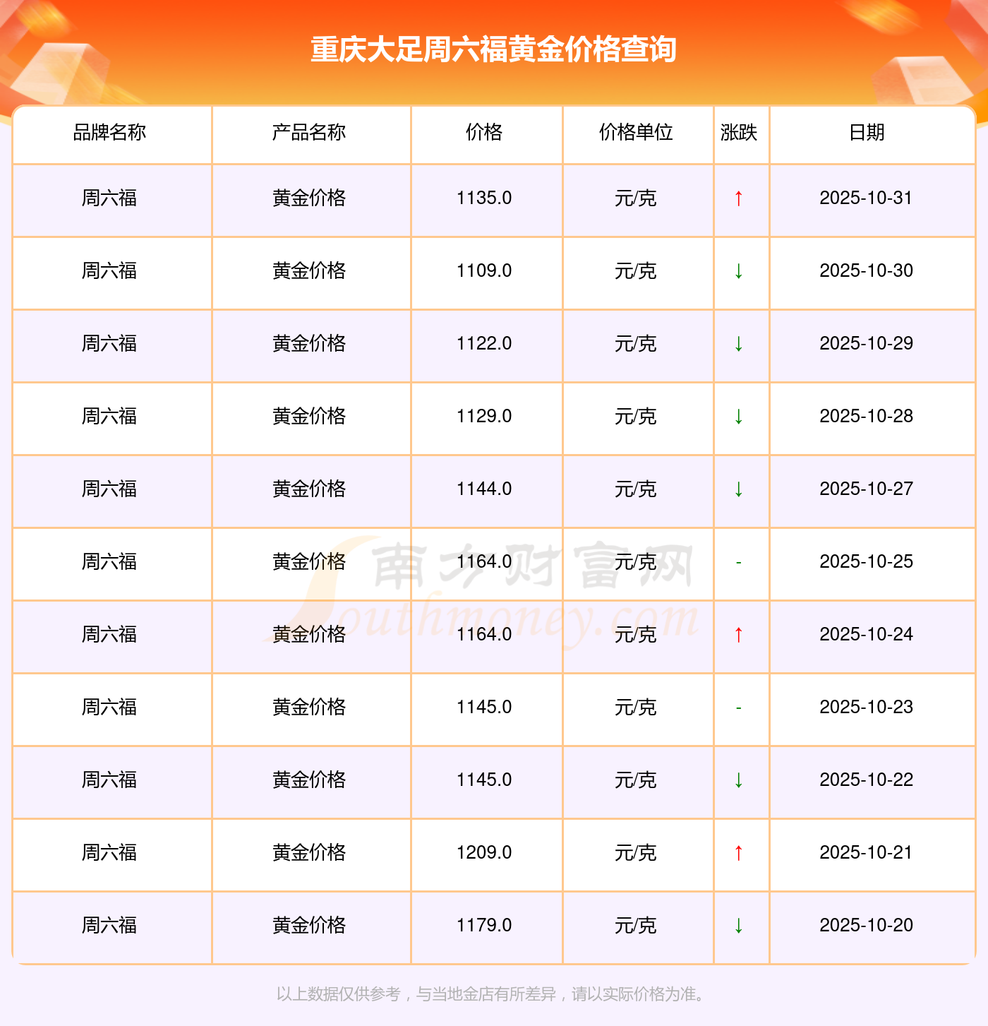 2025年11月1日,重庆大足周六福的黄金价格标价达到 1135.0元/克。