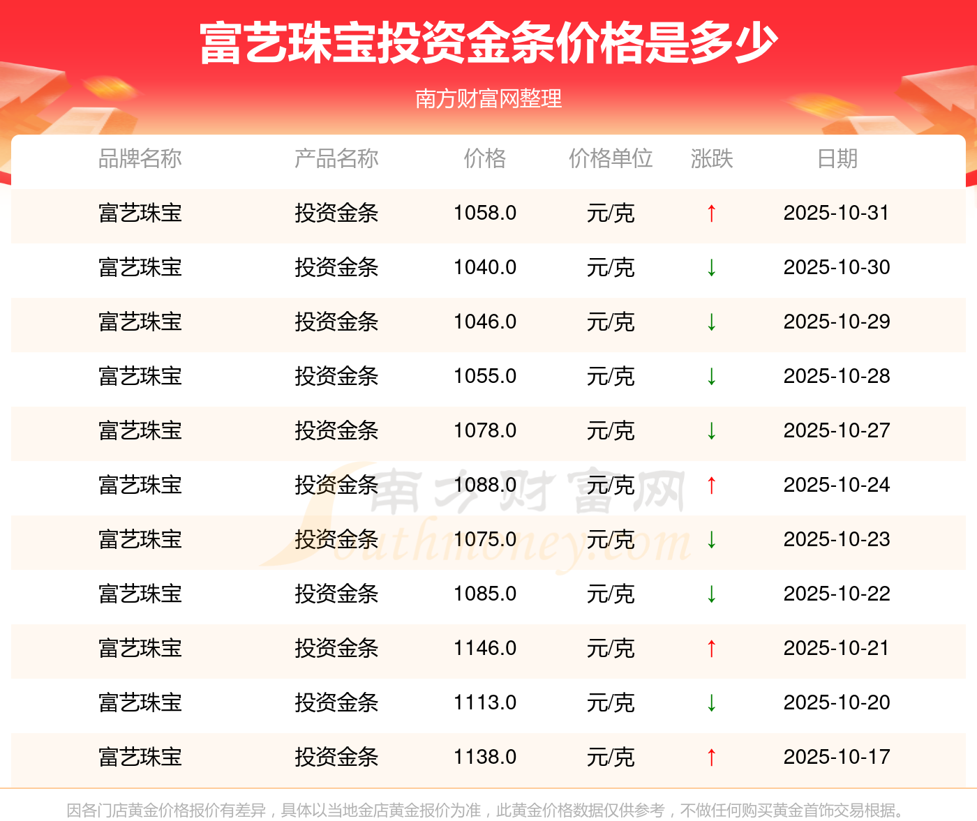 1058.0元/克的价格,是富艺珠宝今日 投资金条的最新行情。