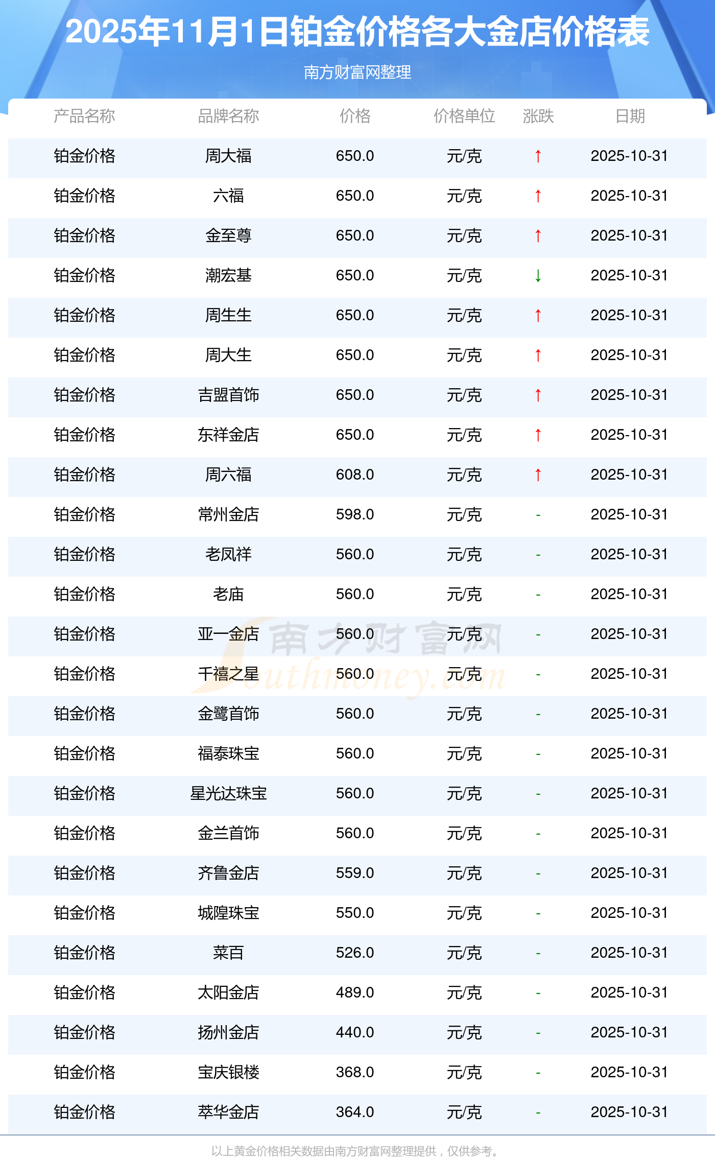 2025年11月1日各大金店铂金价格最新价格:周大福1198.0元/克,周大福650.0元/克,周大福1198.0元/克,周大福44660.0,周大福18640.0,周大福40080.0,周大福1058.0元/克,老凤祥1200.0元/克,老凤祥560.0元/克,老凤祥1200.0元/克,周六福1135.0元/克。
