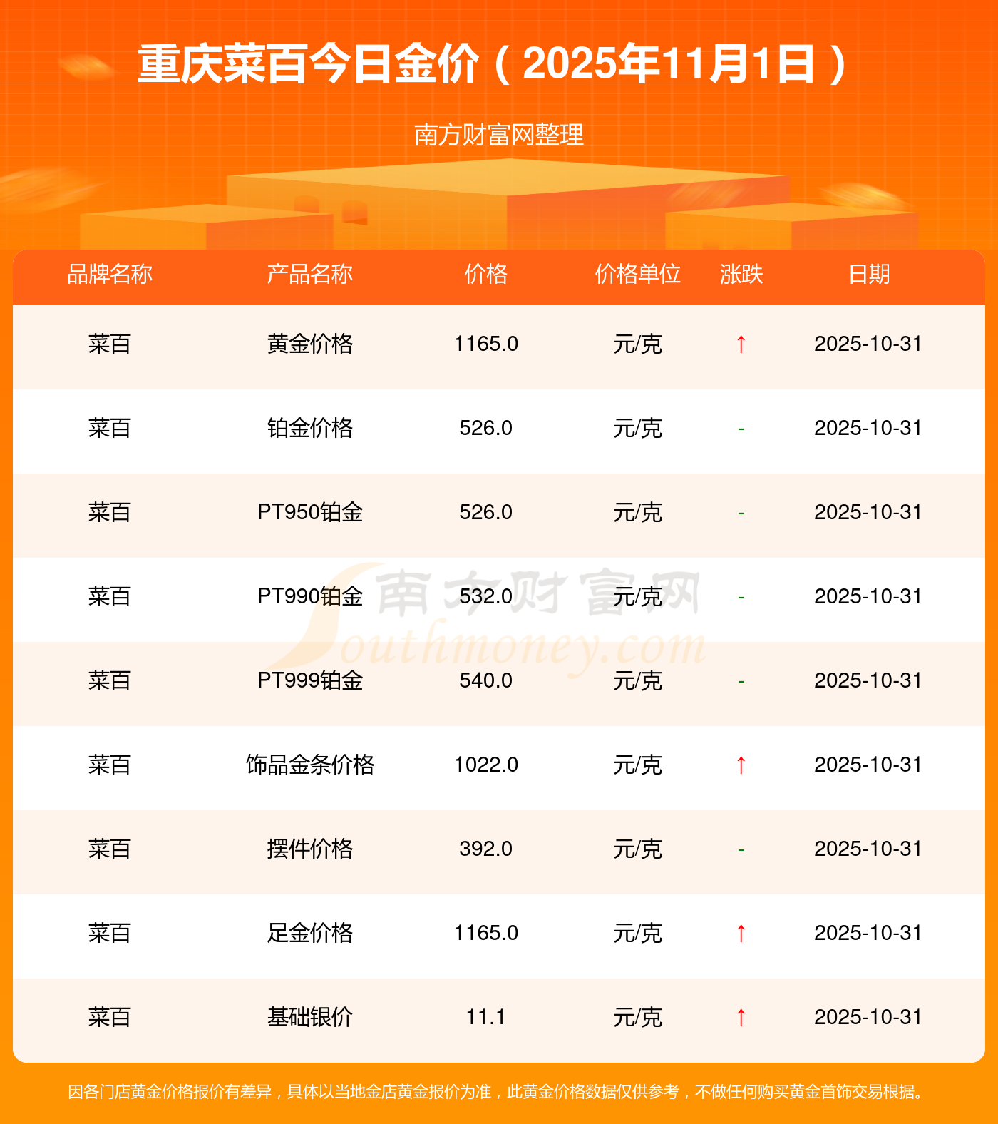 2025年11月1日重庆菜百现在购买一克黄金需要支付多少钱?黄金价格1198.0元/克,铂金价格650.0元/克,饰品金价(内地)1198.0元/克,黄金饰品(香港)44660.0,铂金价格(香港)18640.0,金条价格(香港)40080.0,金条金价(内地)1058.0元/克,黄金价格1200.0元/克,铂金价格560.0元/克,足金价格1200.0元/克,黄金价格1135.0元/克。