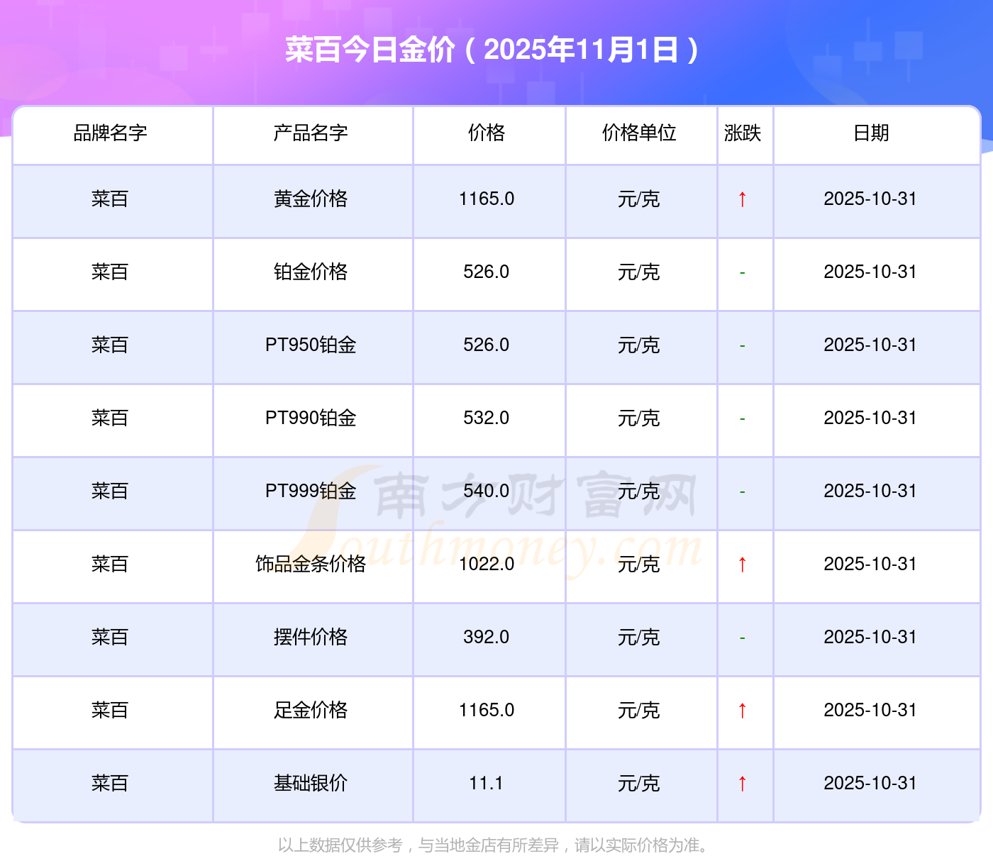 菜百现在金价多少钱一克?菜百今天PT990铂金价格多少一克?最新菜百查询,2025年11月1日菜百PT990铂金现在每克多少钱?最新菜百PT990铂金报价公布,一起来看看吧!