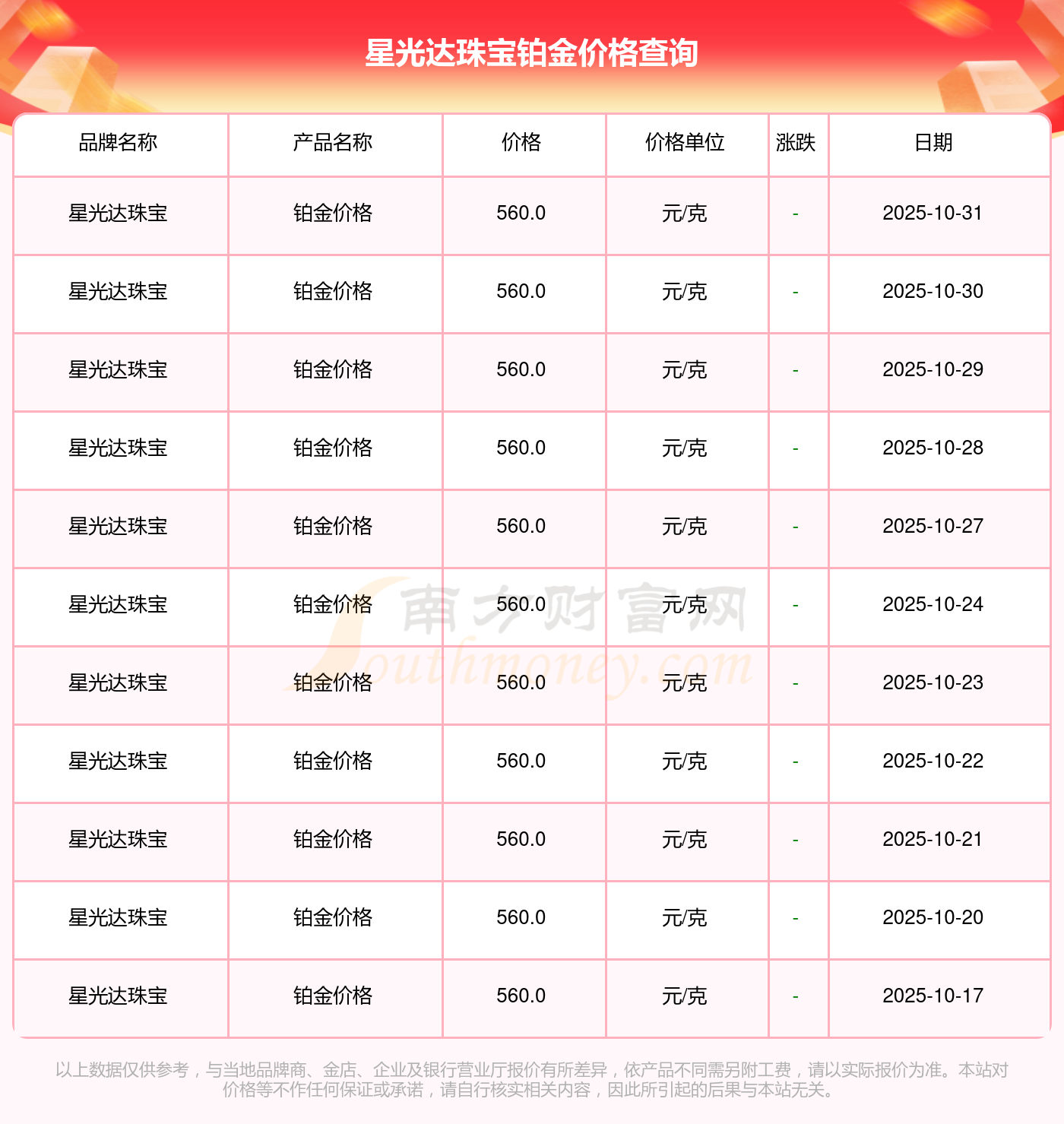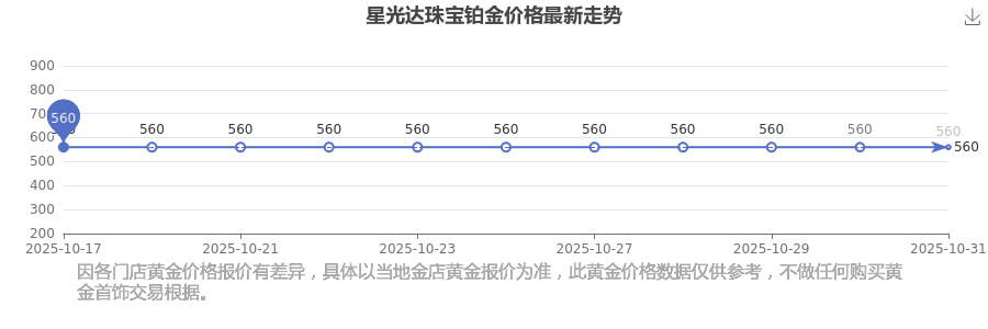 2025年11月1日星光达珠宝铂金价格最新为560.0元/克。