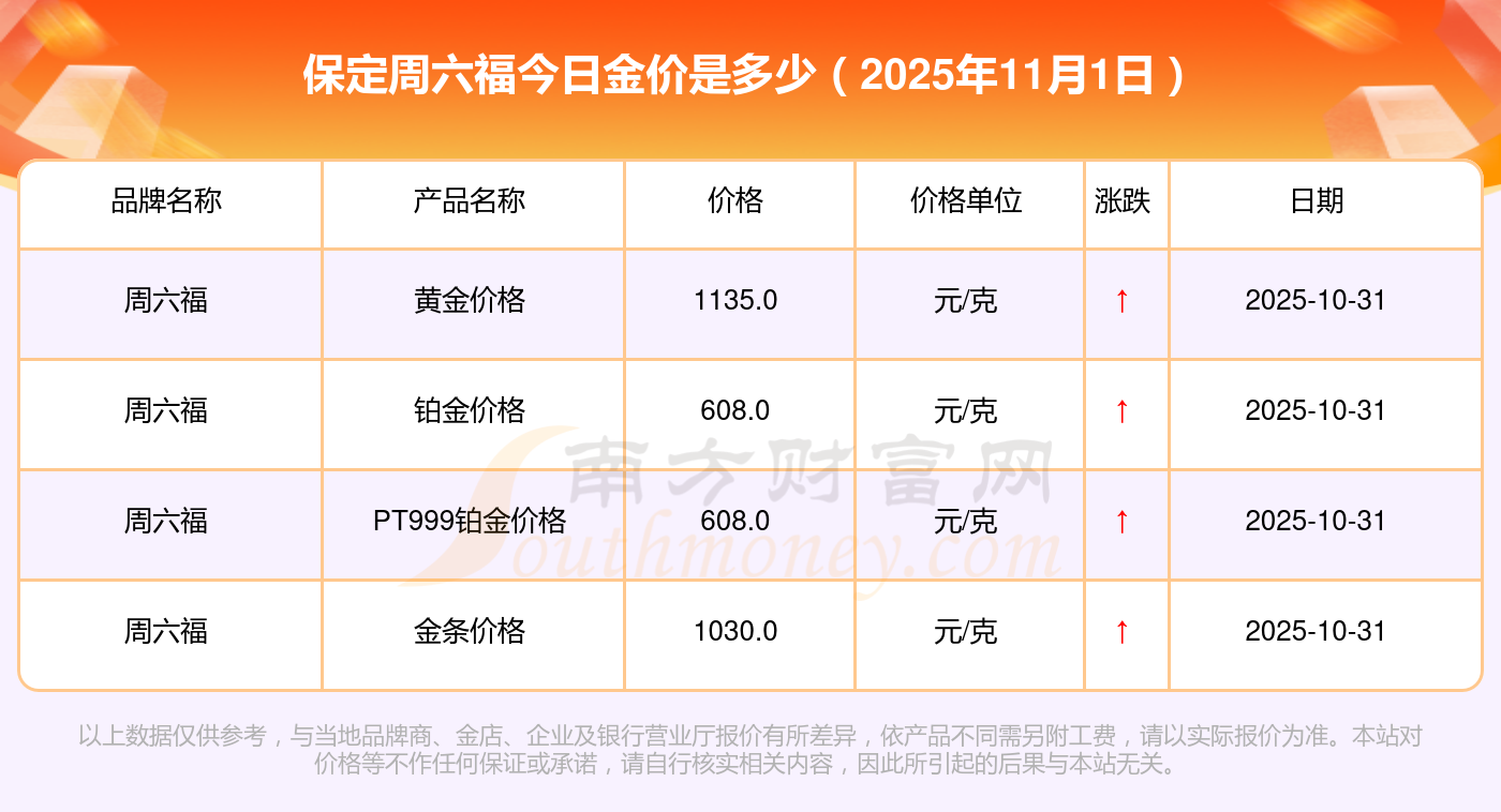 今天黄金价格几何?现在每克黄金值多少钱?2025年11月1日保定周六福黄金的单价,一克为多少?黄金价格1198.0元/克,铂金价格650.0元/克,饰品金价(内地)1198.0元/克,黄金饰品(香港)44660.0,铂金价格(香港)18640.0,金条价格(香港)40080.0,金条金价(内地)1058.0元/克,黄金价格1200.0元/克,铂金价格560.0元/克,足金价格1200.0元/克,黄金价格1135.0元/克。