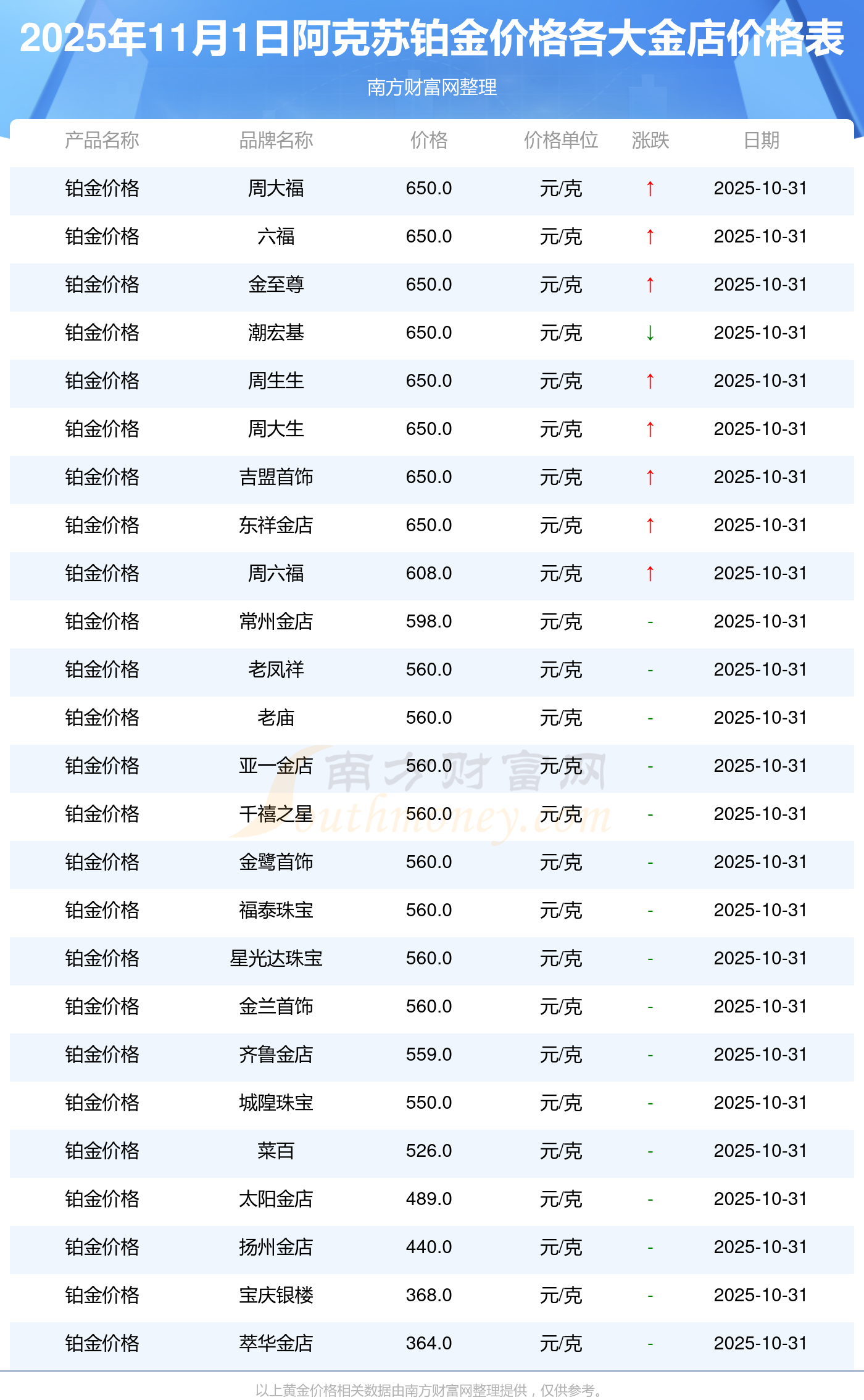 2025年11月1日阿克苏周大福、周大福、周大福、周大福、周大福、周大福、周大福、老凤祥、老凤祥、老凤祥、周六福等各大金店品牌铂金价格最新价格行情来了,如下:周大福黄金价格1198.0元/克,周大福铂金价格650.0元/克,周大福饰品金价(内地)1198.0元/克,周大福黄金饰品(香港)44660.0,周大福铂金价格(香港)18640.0,周大福金条价格(香港)40080.0,周大福金条金价(内地)1058.0元/克,老凤祥黄金价格1200.0元/克,老凤祥铂金价格560.0元/克,老凤祥足金价格1200.0元/克,周六福黄金价格1135.0元/克。