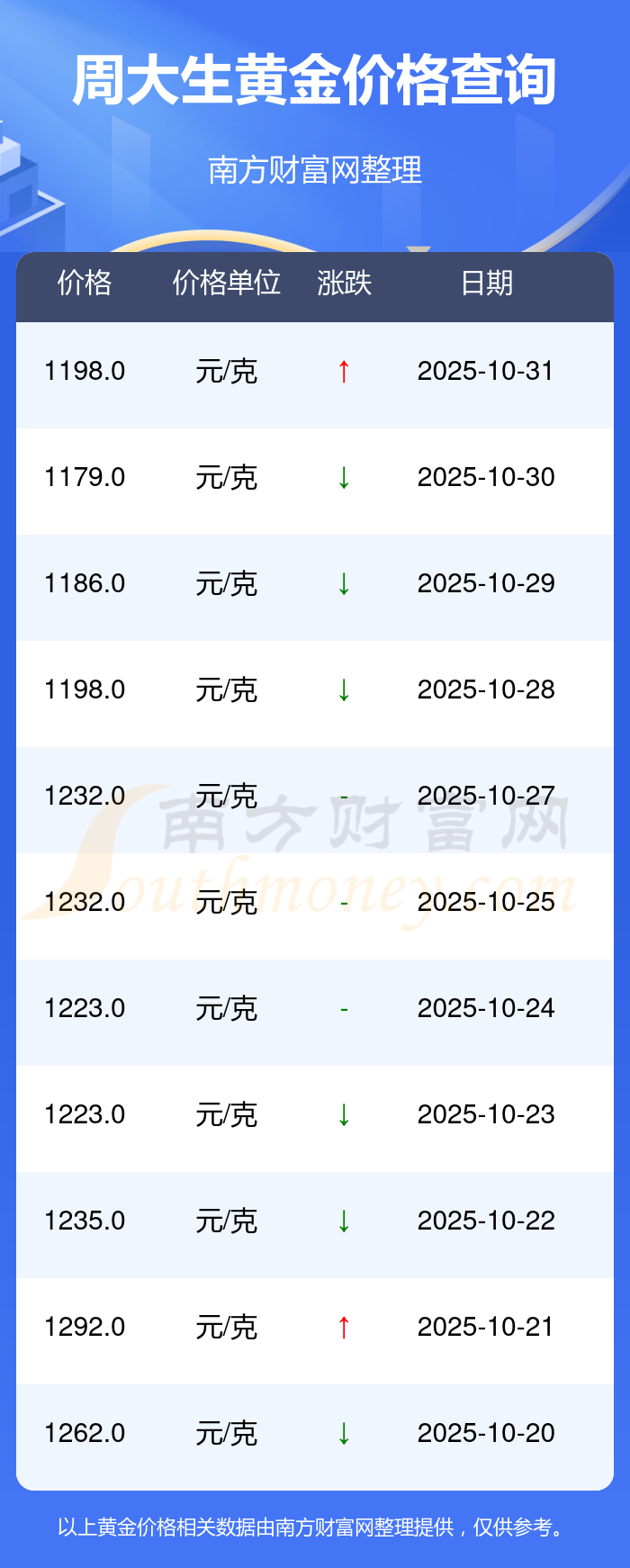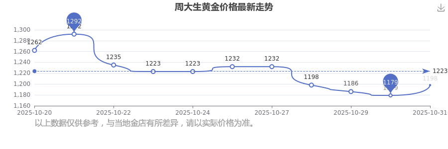 今日黄金价格查询_现在金价黄金一克多少钱,黄金价格是多少钱一克?黄金每一克的价格大概是多少?周大生今日 黄金价格的最新市场行情价为1198.0元/克。