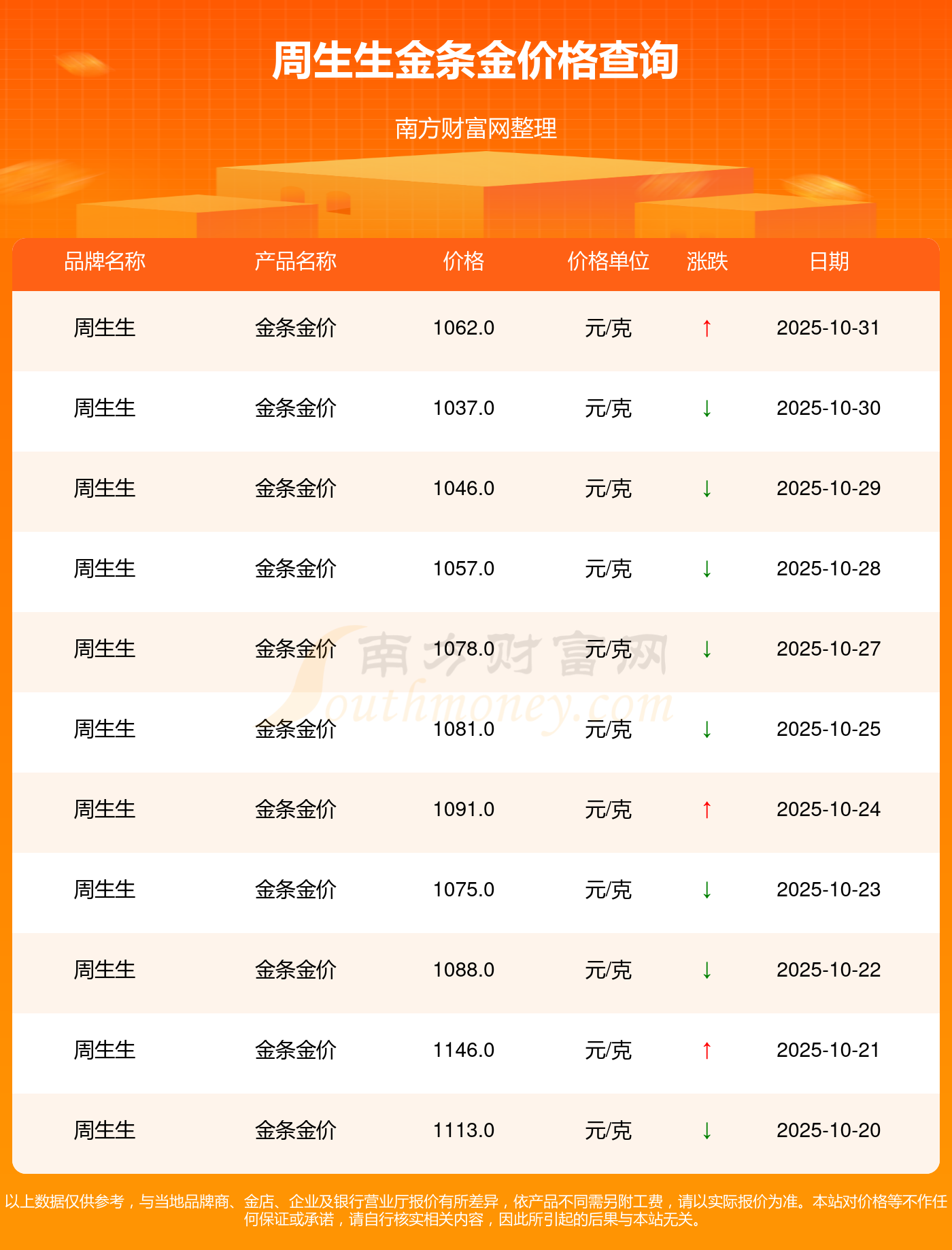 以上数据仅供参考,与当地品牌商、金店、企业及银行营业厅报价有所差异,依产品不同需另附工费,请以实际报价为准。本站对价格等不作任何保证或承诺,请自行核实相关内容,因此所引起的后果与本站无关。