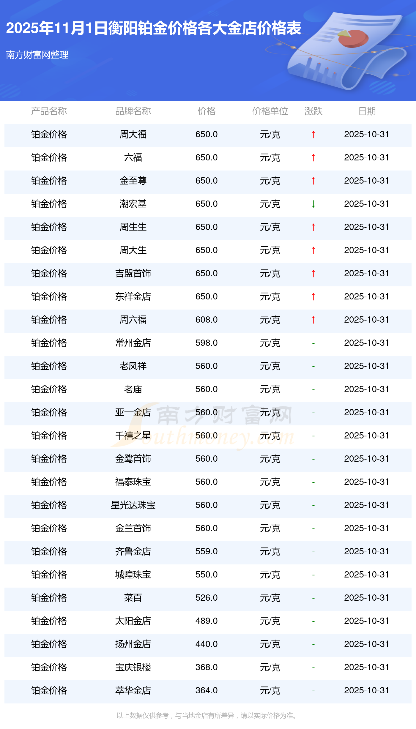 2025年11月1日衡阳各大金店铂金价格最新价格查询来了:周大福1198.0元/克,周大福650.0元/克,周大福1198.0元/克,周大福44660.0,周大福18640.0,周大福40080.0,周大福1058.0元/克,老凤祥1200.0元/克,老凤祥560.0元/克,老凤祥1200.0元/克,周六福1135.0元/克。