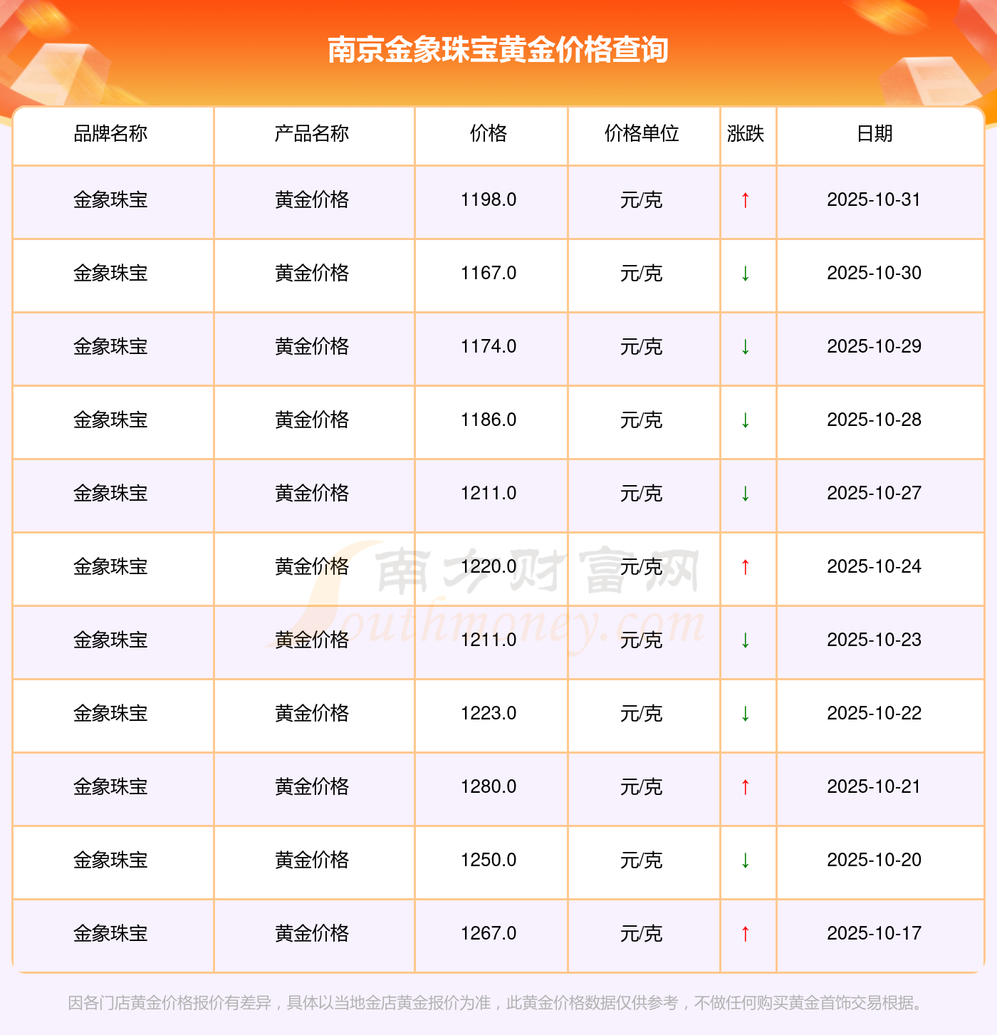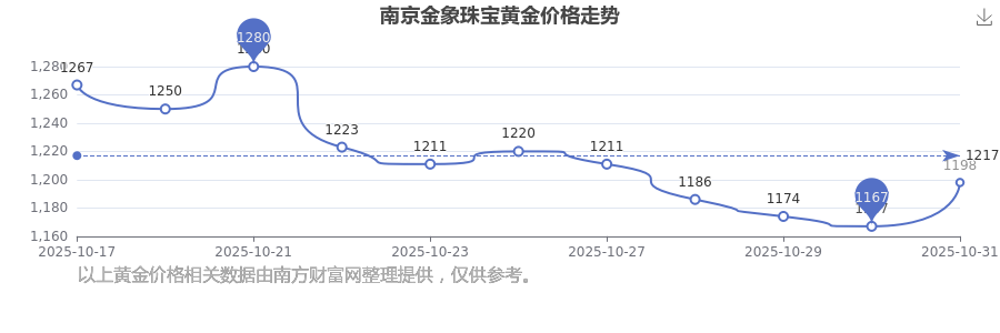 2025年11月1日,今日南京金象珠宝黄金价格:1198.0元/克。