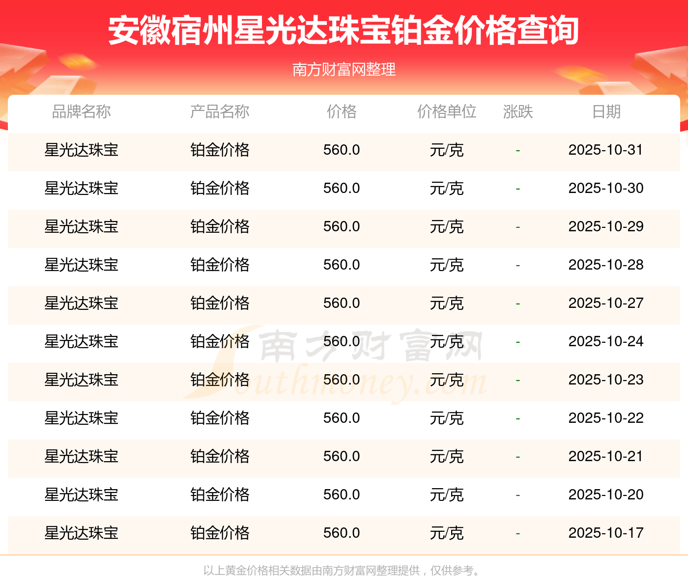 安徽宿州星光达珠宝 2025年11月1日的铂金价格价位为 560.0元/克。