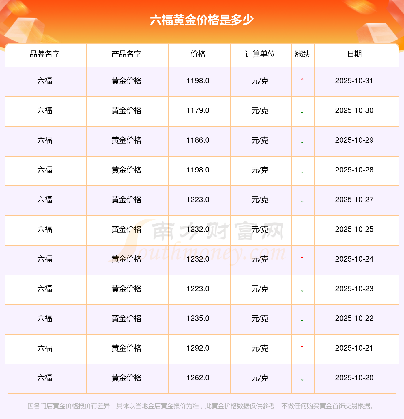 今日六福所公布的 黄金价格最新价格为1198.0元/克。