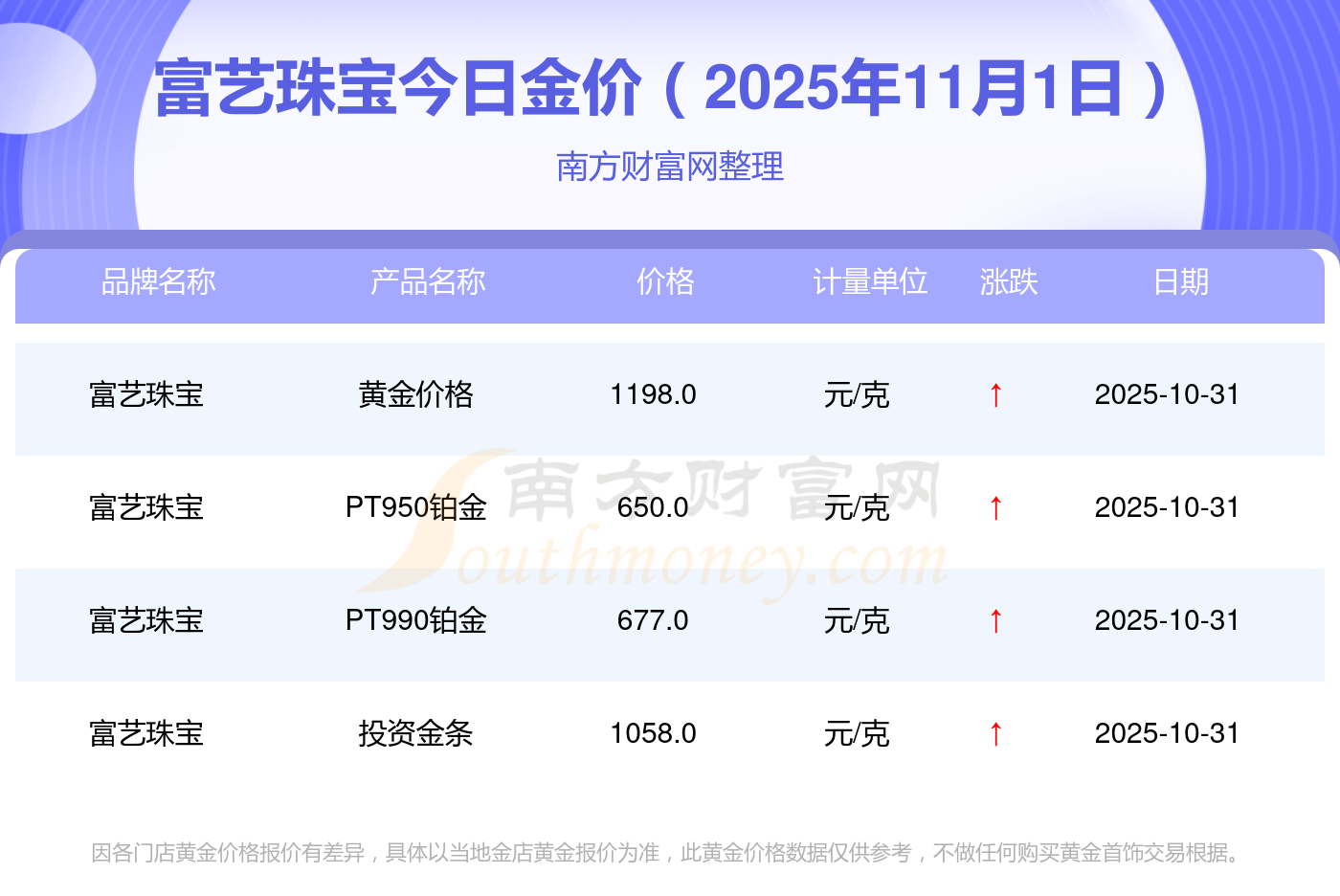 现在富艺珠宝黄金价格是多少钱1克_2025年富艺珠宝今日金价是多少钱一克,最新富艺珠宝查询,2025年11月1日富艺珠宝PT950铂金现在每克多少钱?最新富艺珠宝PT950铂金报价公布,一起来看看吧!