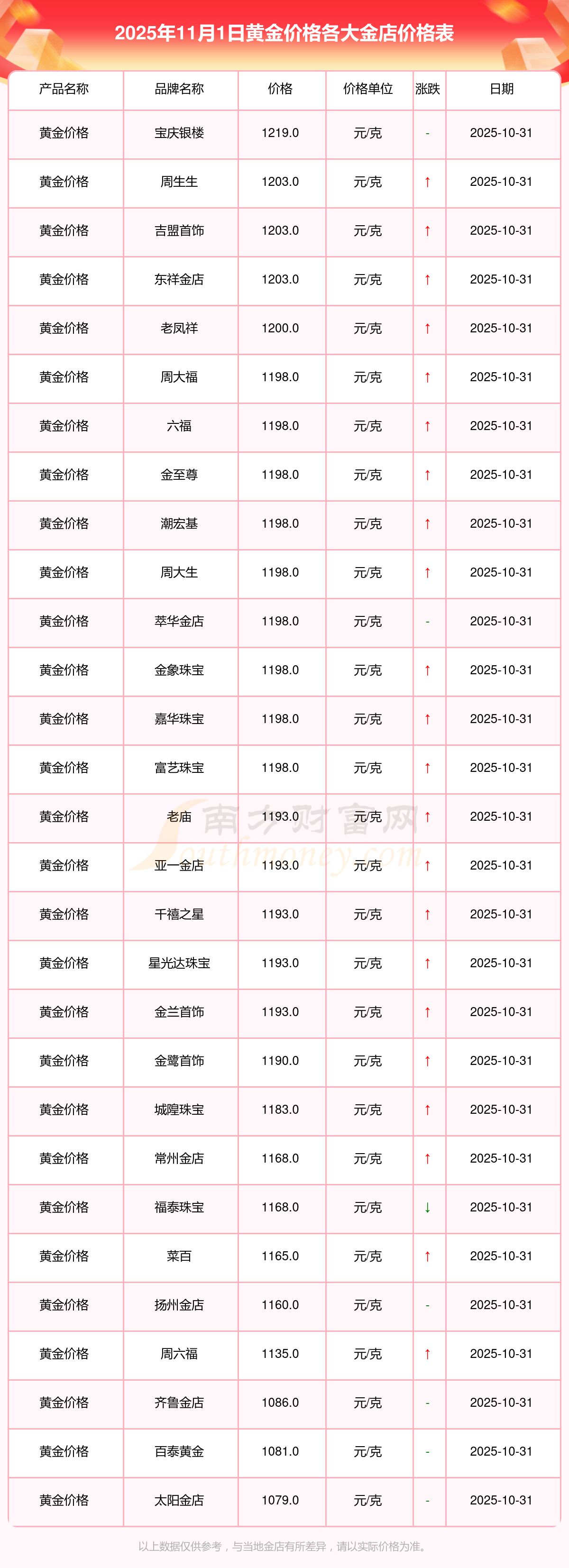 2025年11月1日各大金店黄金价格是多少钱?各大金店黄金价格最新公布,每家金店的黄金价格之所以不一样,黄金基础价格是由国际黄金市场的供求关系和价格波动所定的。金店会根据国际金价的变化来制定和调整金饰的价格。接下来随小编来看看今日市场行情。