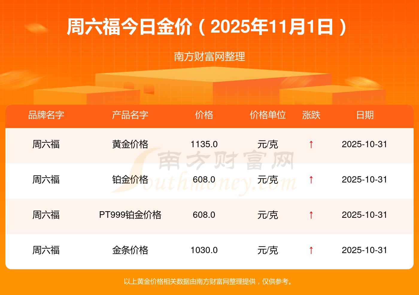 现在周六福黄金价格是多少钱1克_2025年周六福今日金价是多少钱一克,最新周六福查询,2025年11月1日周六福PT999铂金价格现在每克多少钱?最新周六福PT999铂金价格报价公布,一起来看看吧!