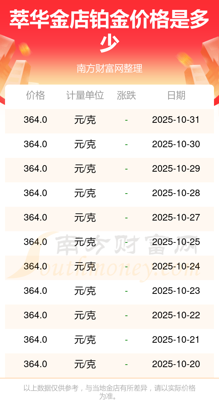364.0元/克是萃华金店在今日给出的 铂金价格最新价格。