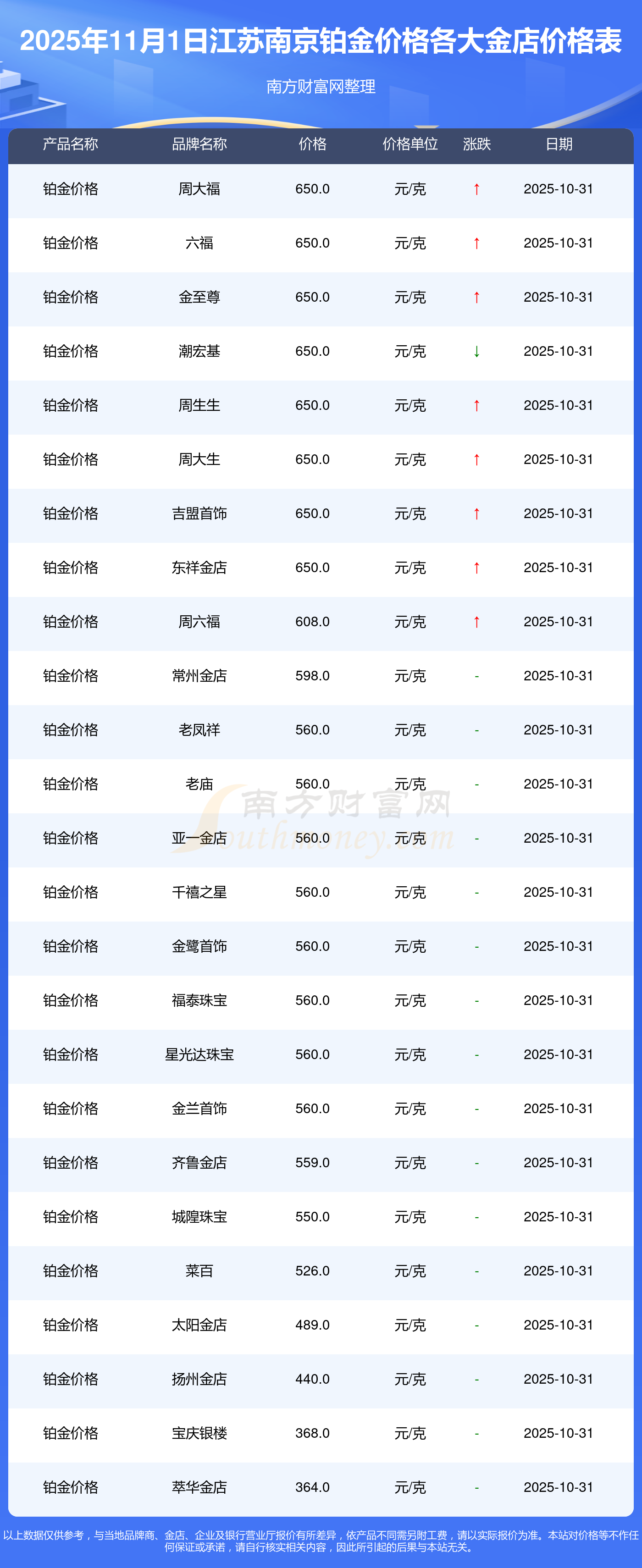 2025年11月1日江苏南京周大福、周大福、周大福、周大福、周大福、周大福、周大福、老凤祥、老凤祥、老凤祥、周六福等各大金店品牌铂金价格最新价格行情来了,如下:周大福黄金价格1198.0元/克,周大福铂金价格650.0元/克,周大福饰品金价(内地)1198.0元/克,周大福黄金饰品(香港)44660.0,周大福铂金价格(香港)18640.0,周大福金条价格(香港)40080.0,周大福金条金价(内地)1058.0元/克,老凤祥黄金价格1200.0元/克,老凤祥铂金价格560.0元/克,老凤祥足金价格1200.0元/克,周六福黄金价格1135.0元/克。