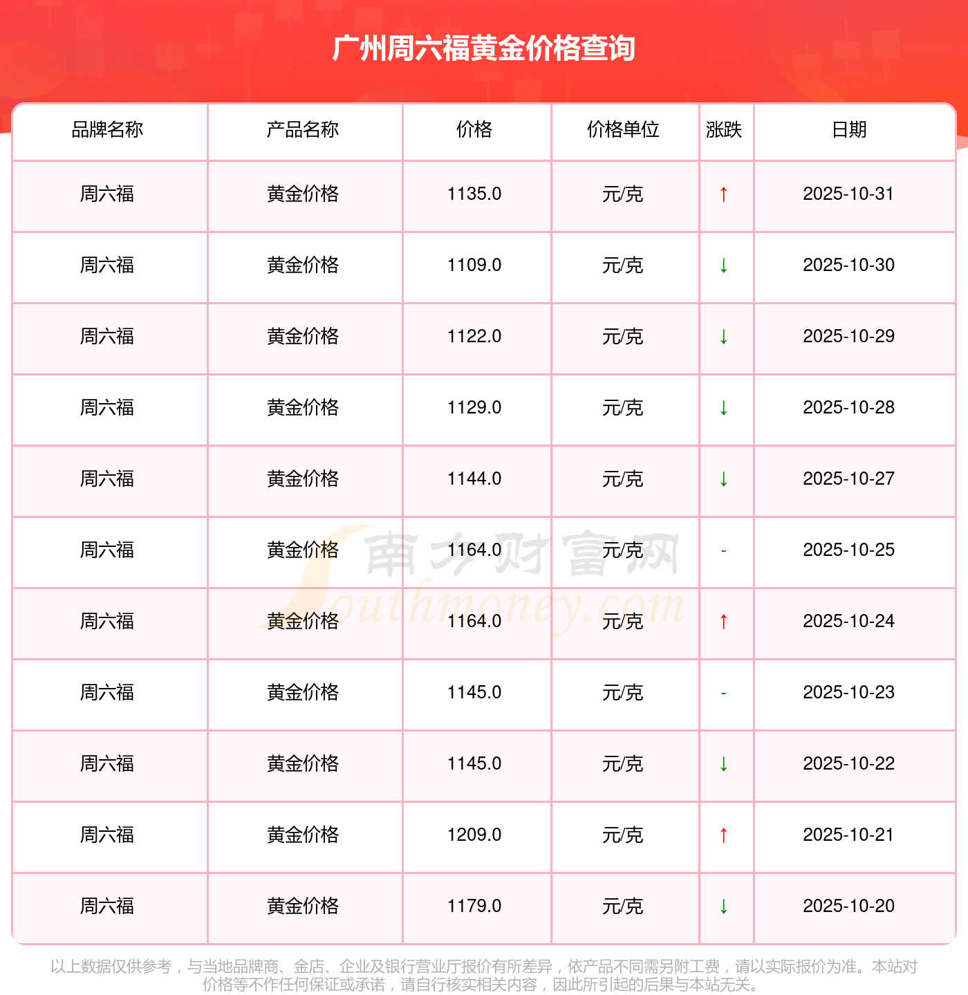 今日广州周六福黄金价格最新价格是1135.0元/克。