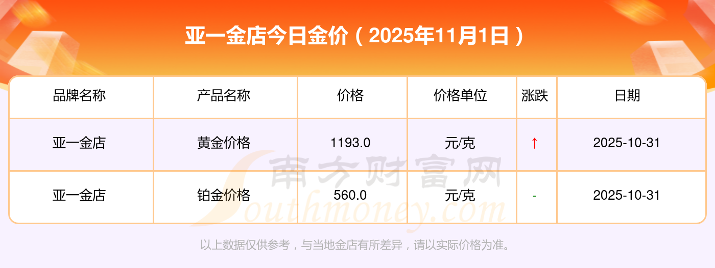 亚一金店现在金价多少钱一克?亚一金店今天铂金价格多少一克?最新亚一金店查询,2025年11月1日亚一金店铂金价格现在每克多少钱?最新亚一金店铂金价格报价公布,一起来看看吧!