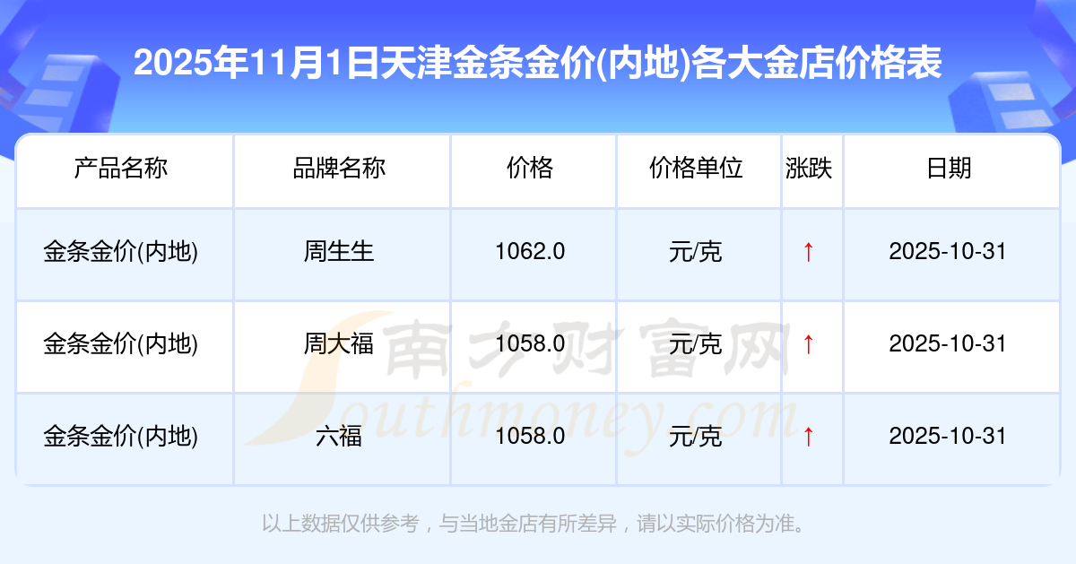 2025年11月1日天津各大金店金条金价(内地)最新价格:周大福1198.0元/克,周大福650.0元/克,周大福1198.0元/克,周大福44660.0,周大福18640.0,周大福40080.0,周大福1058.0元/克,老凤祥1200.0元/克,老凤祥560.0元/克,老凤祥1200.0元/克,周六福1135.0元/克。