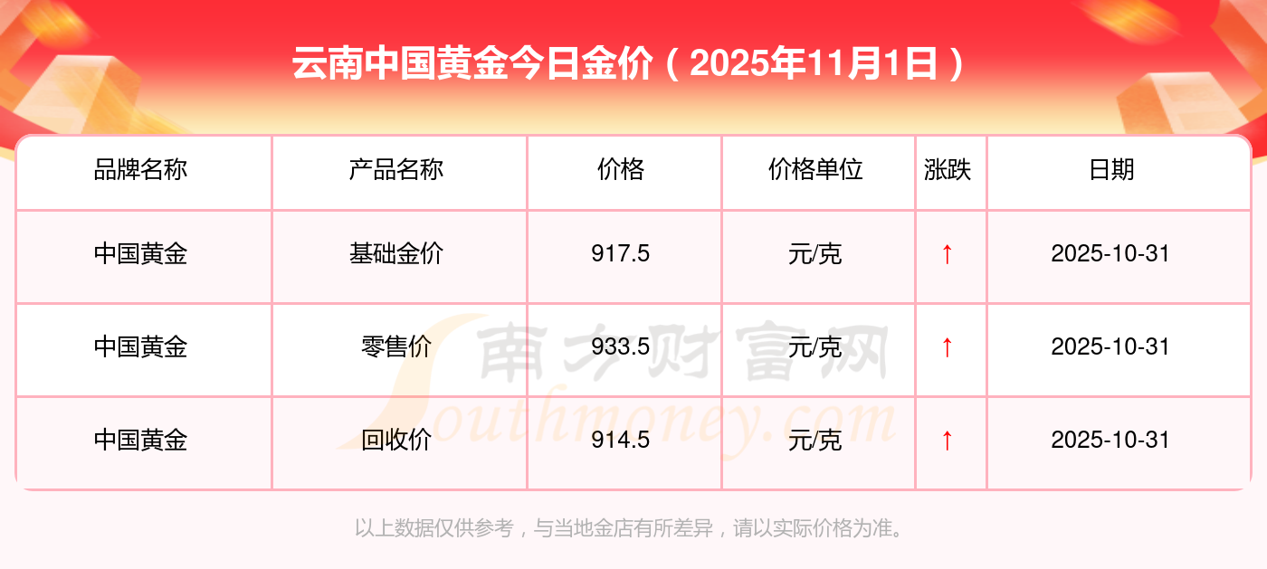 2025年11月1日云南中国黄金现在黄金一克要多少钱:黄金价格1198.0元/克,铂金价格650.0元/克,饰品金价(内地)1198.0元/克,黄金饰品(香港)44660.0,铂金价格(香港)18640.0,金条价格(香港)40080.0,金条金价(内地)1058.0元/克,黄金价格1200.0元/克,铂金价格560.0元/克,足金价格1200.0元/克,黄金价格1135.0元/克。