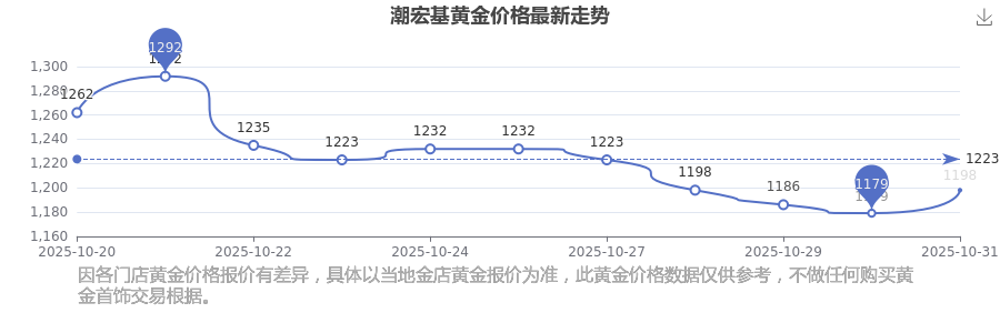 今日潮宏基 黄金价格最新的克重售价为1198.0元/克。