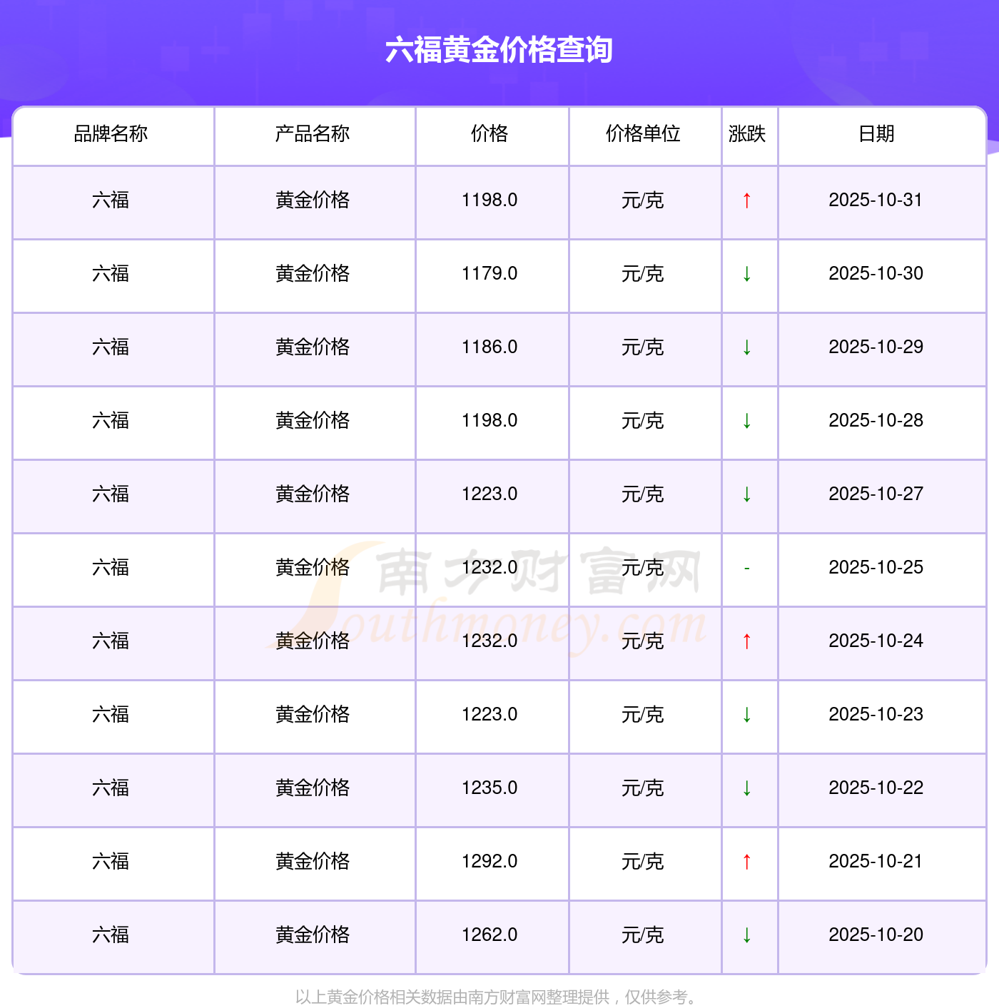 今日黄金价格查询_现在金价黄金一克多少钱,黄金价格是多少钱一克?黄金价格一般是多少钱一克?2025年11月1日六福黄金价格最新为1198.0元/克。