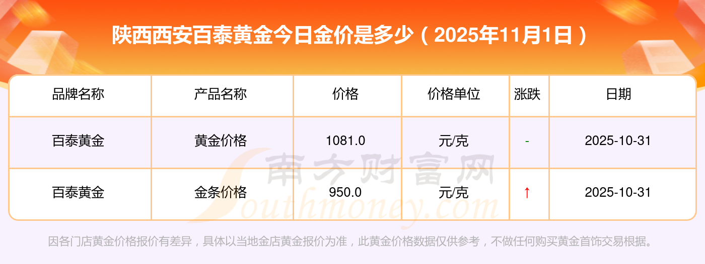 2025年11月1日陕西西安百泰黄金今日价格:黄金价格1198.0元/克,铂金价格650.0元/克,饰品金价(内地)1198.0元/克,黄金饰品(香港)44660.0,铂金价格(香港)18640.0,金条价格(香港)40080.0,金条金价(内地)1058.0元/克,黄金价格1200.0元/克,铂金价格560.0元/克,足金价格1200.0元/克,黄金价格1135.0元/克。