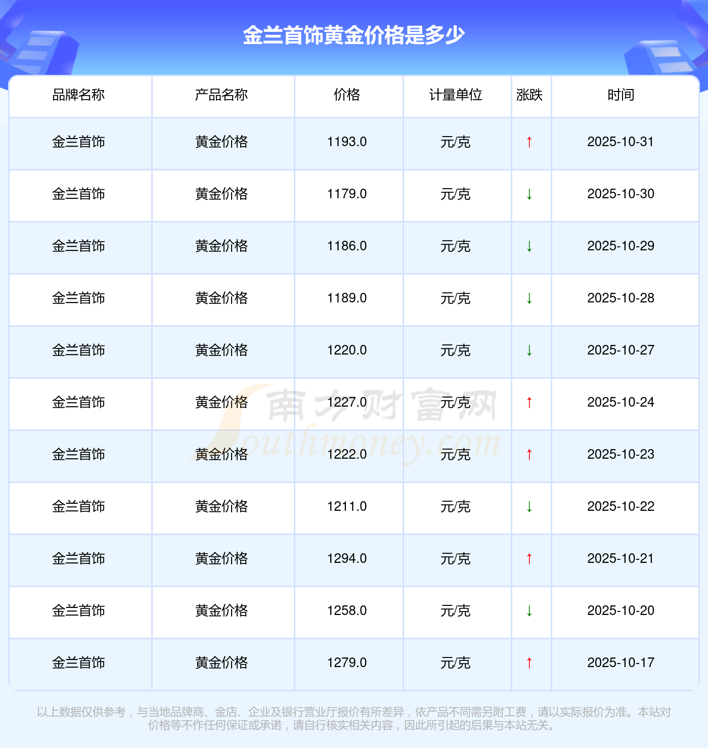 金兰首饰黄金价格现在一克多少钱(2025年11月1日)