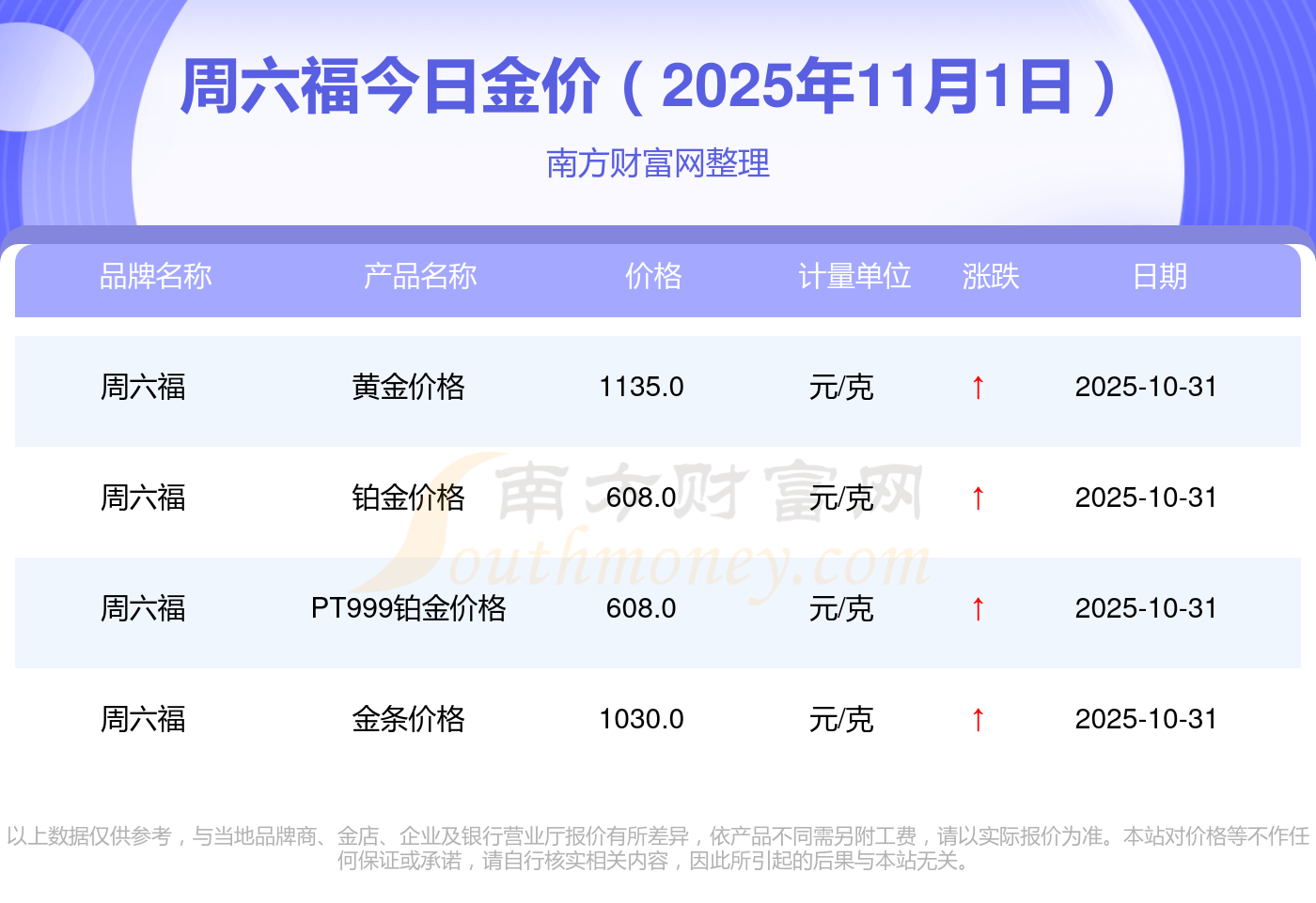 现在周六福黄金价格是多少钱1克_2025年周六福今日金价是多少钱一克,最新周六福查询,2025年11月1日周六福铂金价格现在每克多少钱?最新周六福铂金价格报价公布,一起来看看吧!