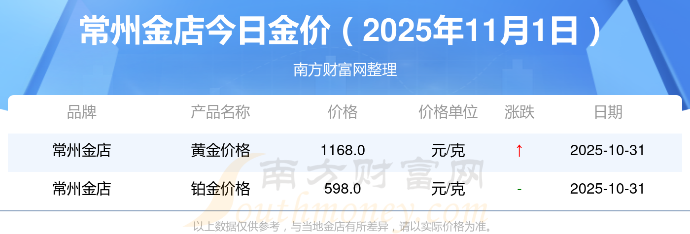 2025年11月1日常州金店今日价格:黄金价格1198.0元/克,铂金价格650.0元/克,饰品金价(内地)1198.0元/克,黄金饰品(香港)44660.0,铂金价格(香港)18640.0,金条价格(香港)40080.0,金条金价(内地)1058.0元/克,黄金价格1200.0元/克,铂金价格560.0元/克,足金价格1200.0元/克,黄金价格1135.0元/克。