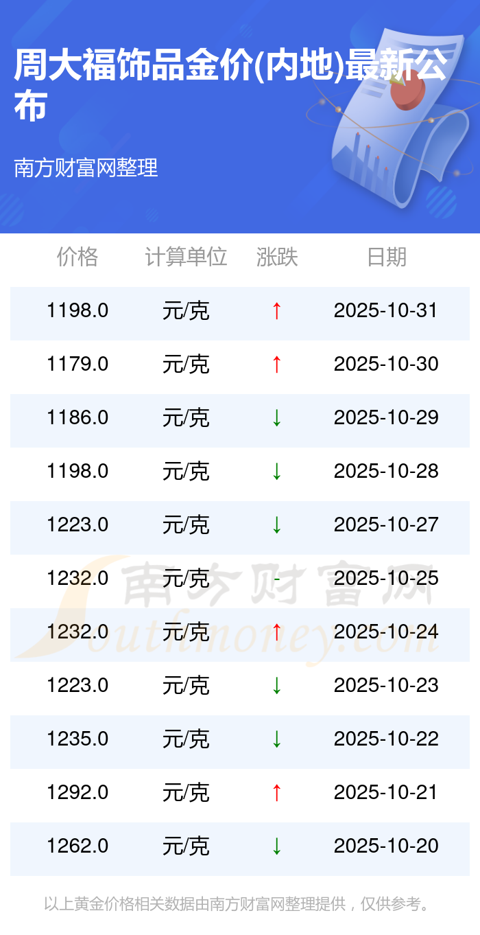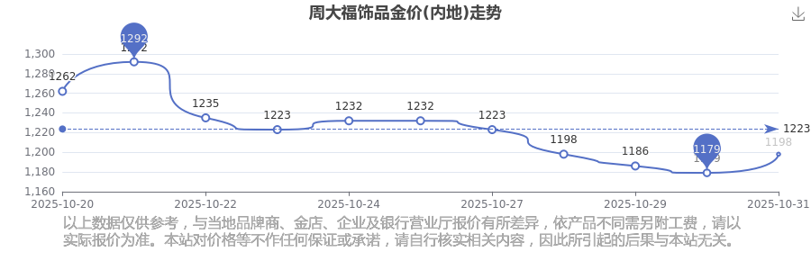 今日周大福饰品金价(内地)为1198.0元/克。