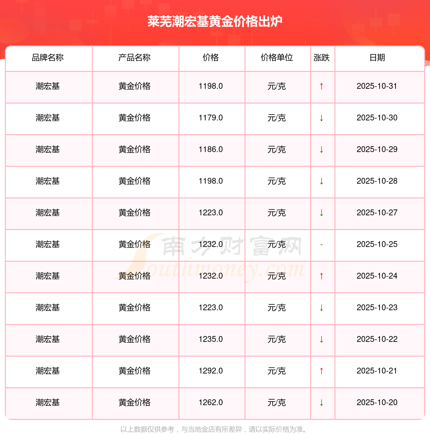 今日莱芜潮宏基黄金价格公布今天的黄金,以克为单位,其价格是多少2025年11月1日,莱芜潮宏基的黄金价格标价达到 1198.0元/克。