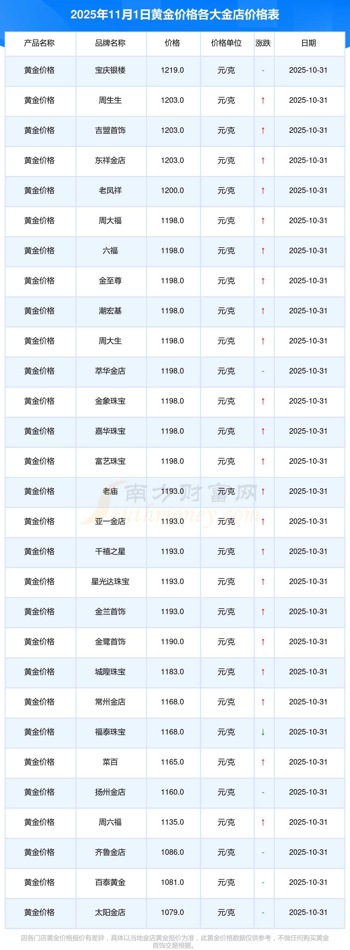 2025年11月1日,周大福、周大福、周大福、周大福、周大福、周大福、周大福、老凤祥、老凤祥、老凤祥、周六福等各大金店品牌黄金价格今日价格如下:周大福1198.0元/克、周大福650.0元/克、周大福1198.0元/克、周大福44660.0、周大福18640.0、周大福40080.0、周大福1058.0元/克、老凤祥1200.0元/克、老凤祥560.0元/克、老凤祥1200.0元/克、周六福1135.0元/克。
