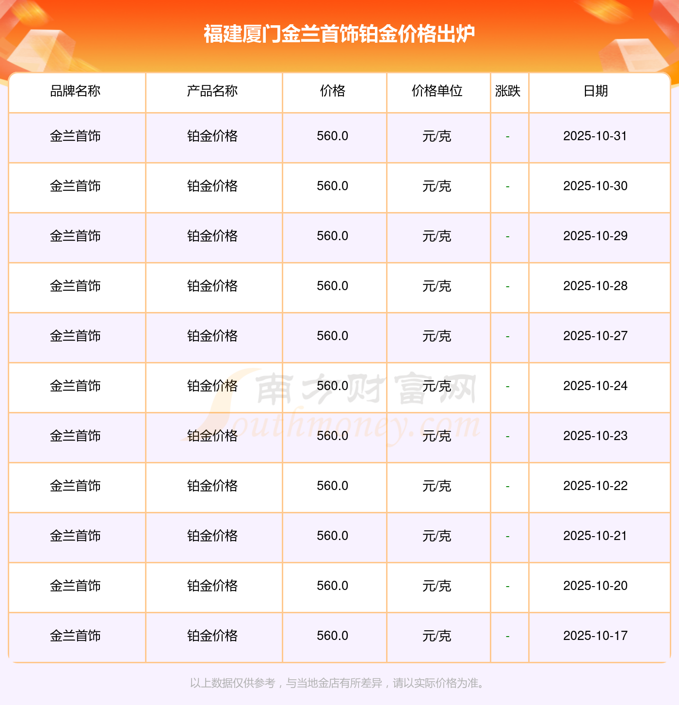 2025年11月1日,周大福、周大福、周大福、周大福、周大福、周大福、周大福、老凤祥、老凤祥、老凤祥、周六福等各大金店品牌铂金价格今日价格如下:周大福1198.0元/克、周大福650.0元/克、周大福1198.0元/克、周大福44660.0、周大福18640.0、周大福40080.0、周大福1058.0元/克、老凤祥1200.0元/克、老凤祥560.0元/克、老凤祥1200.0元/克、周六福1135.0元/克。