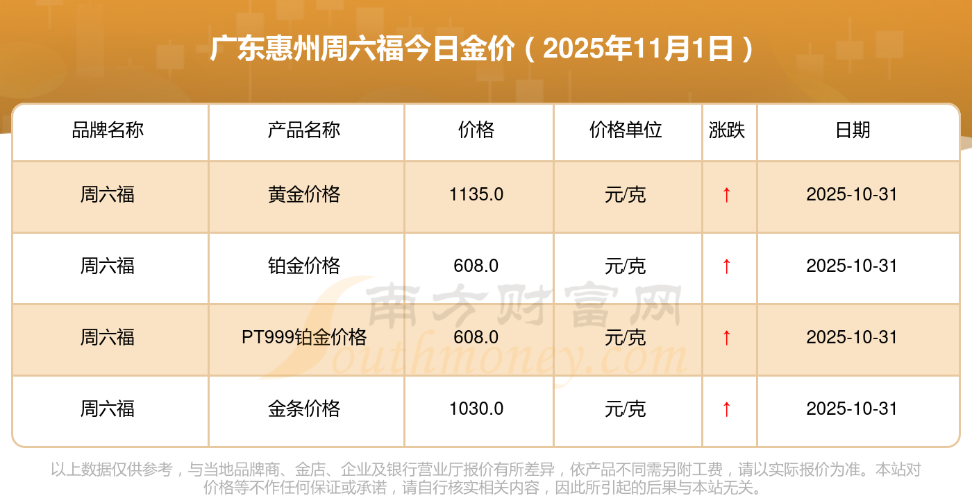 想了解今日黄金价格,现在每克黄金的价格是多少呢?2025年11月1日广东惠州周六福最新价格:黄金价格1198.0元/克,铂金价格650.0元/克,饰品金价(内地)1198.0元/克,黄金饰品(香港)44660.0,铂金价格(香港)18640.0,金条价格(香港)40080.0,金条金价(内地)1058.0元/克,黄金价格1200.0元/克,铂金价格560.0元/克,足金价格1200.0元/克,黄金价格1135.0元/克。