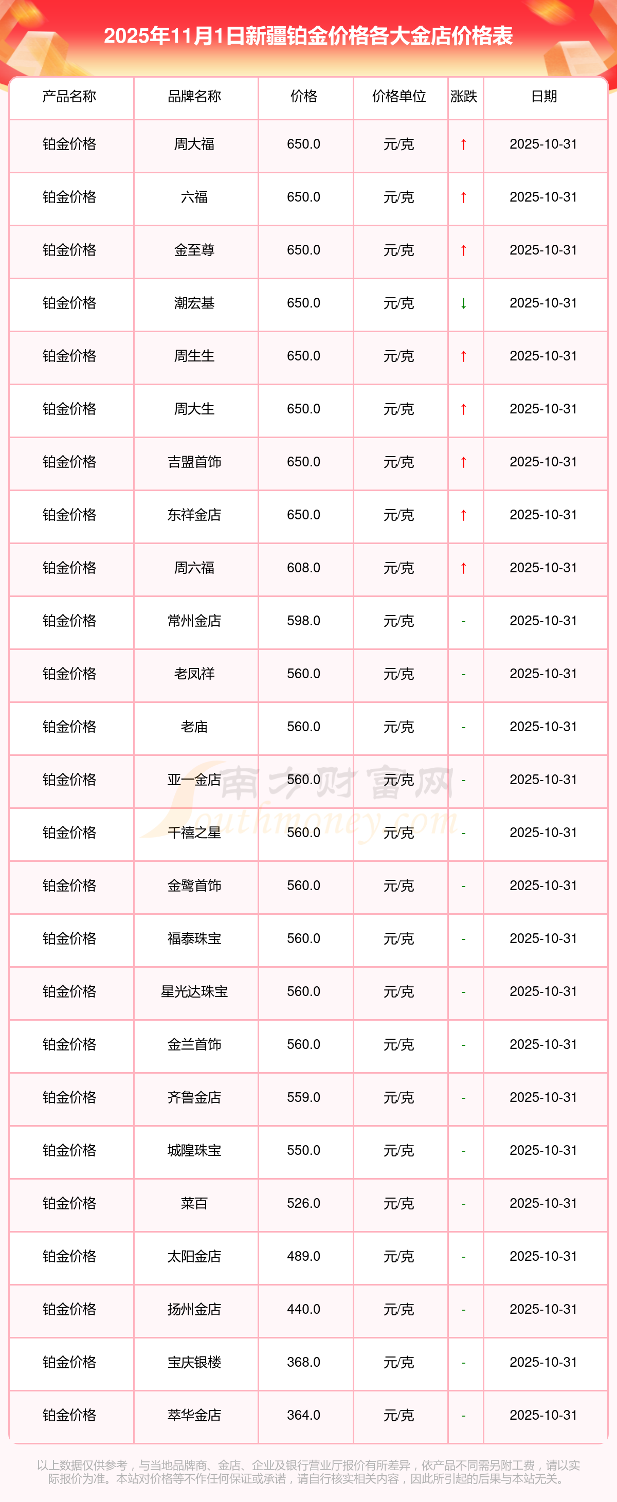 2025年11月1日,新疆周大福、周大福、周大福、周大福、周大福、周大福、周大福、老凤祥、老凤祥、老凤祥、周六福等各大金店品牌铂金价格今日价格行情最新来了:周大福1198.0元/克、周大福650.0元/克、周大福1198.0元/克、周大福44660.0、周大福18640.0、周大福40080.0、周大福1058.0元/克、老凤祥1200.0元/克、老凤祥560.0元/克、老凤祥1200.0元/克、周六福1135.0元/克。