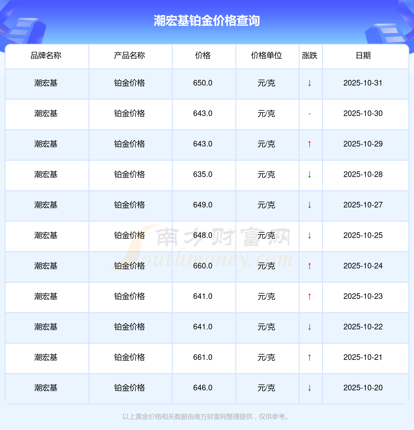 650.0元/克成为潮宏基今日 铂金价格的最新交易的价格。
