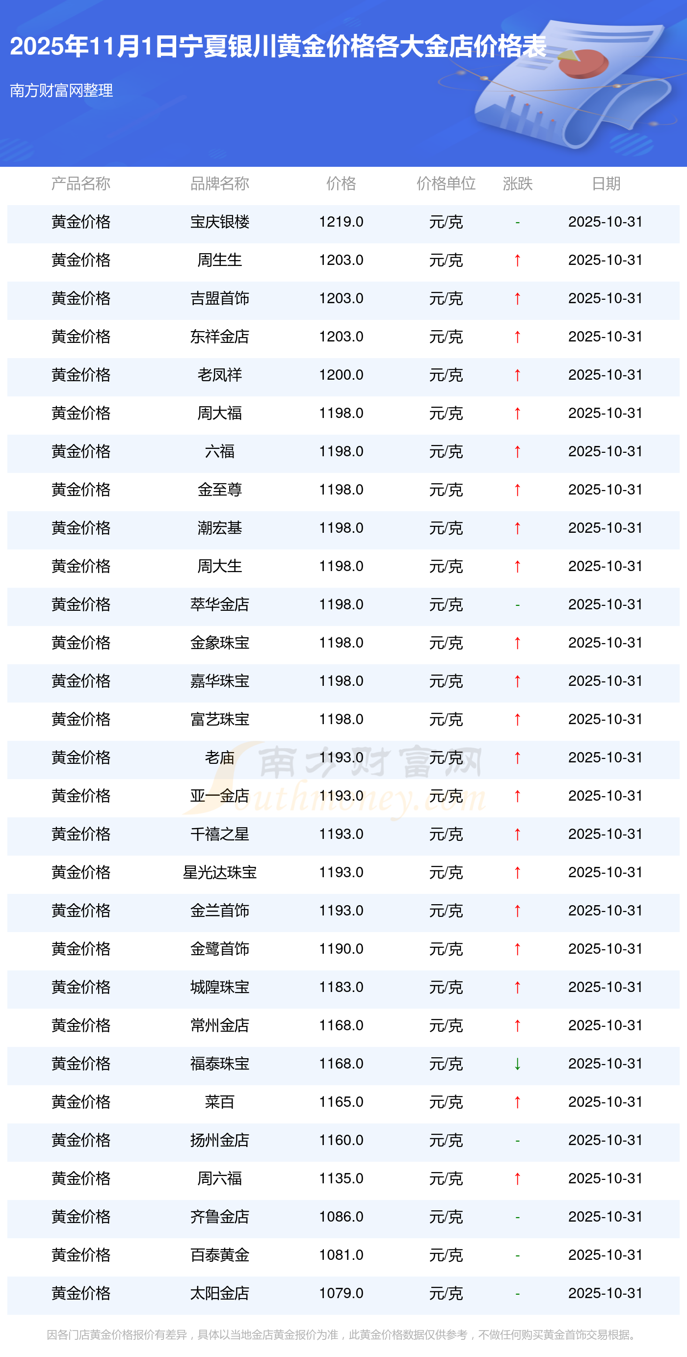 2025年11月1日宁夏银川周大福、周大福、周大福、周大福、周大福、周大福、周大福、老凤祥、老凤祥、老凤祥、周六福等各大金店品牌黄金价格最新价格如下:周大福黄金价格1198.0元/克,周大福铂金价格650.0元/克,周大福饰品金价(内地)1198.0元/克,周大福黄金饰品(香港)44660.0,周大福铂金价格(香港)18640.0,周大福金条价格(香港)40080.0,周大福金条金价(内地)1058.0元/克,老凤祥黄金价格1200.0元/克,老凤祥铂金价格560.0元/克,老凤祥足金价格1200.0元/克,周六福黄金价格1135.0元/克。