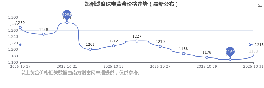 2025年11月1日郑州城隍珠宝黄金价格为1183.0元/克。