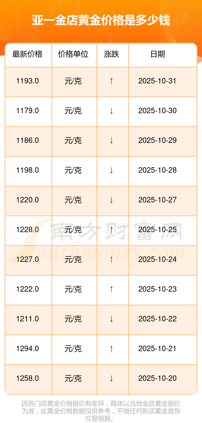 今日黄金售价是多少呢?此刻每克黄金价钱怎样?黄金每一克的价格通常来说是多少?今日(2025年11月1日)亚一金店黄金价格为1193.0元/克。