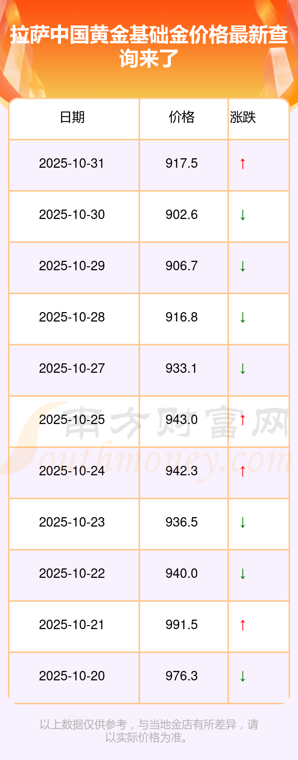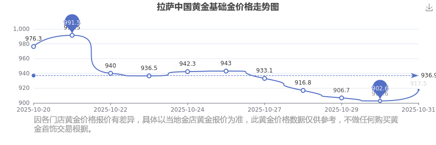今日(2025年11月1日),拉萨中国黄金基础金价的定价为 917.5元/克。