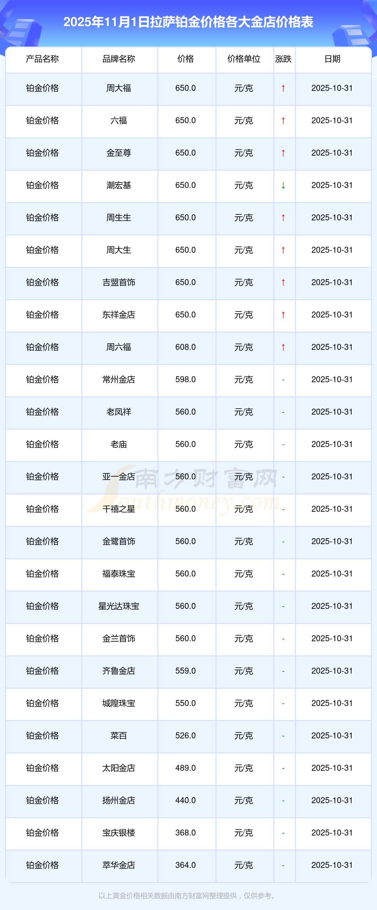 2025年11月1日,拉萨周大福、周大福、周大福、周大福、周大福、周大福、周大福、老凤祥、老凤祥、老凤祥、周六福等各大金店品牌铂金价格今日价格行情最新来了:周大福1198.0元/克、周大福650.0元/克、周大福1198.0元/克、周大福44660.0、周大福18640.0、周大福40080.0、周大福1058.0元/克、老凤祥1200.0元/克、老凤祥560.0元/克、老凤祥1200.0元/克、周六福1135.0元/克。