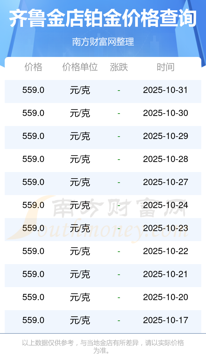 齐鲁金店 铂金价格今日最新的价位是559.0元/克。