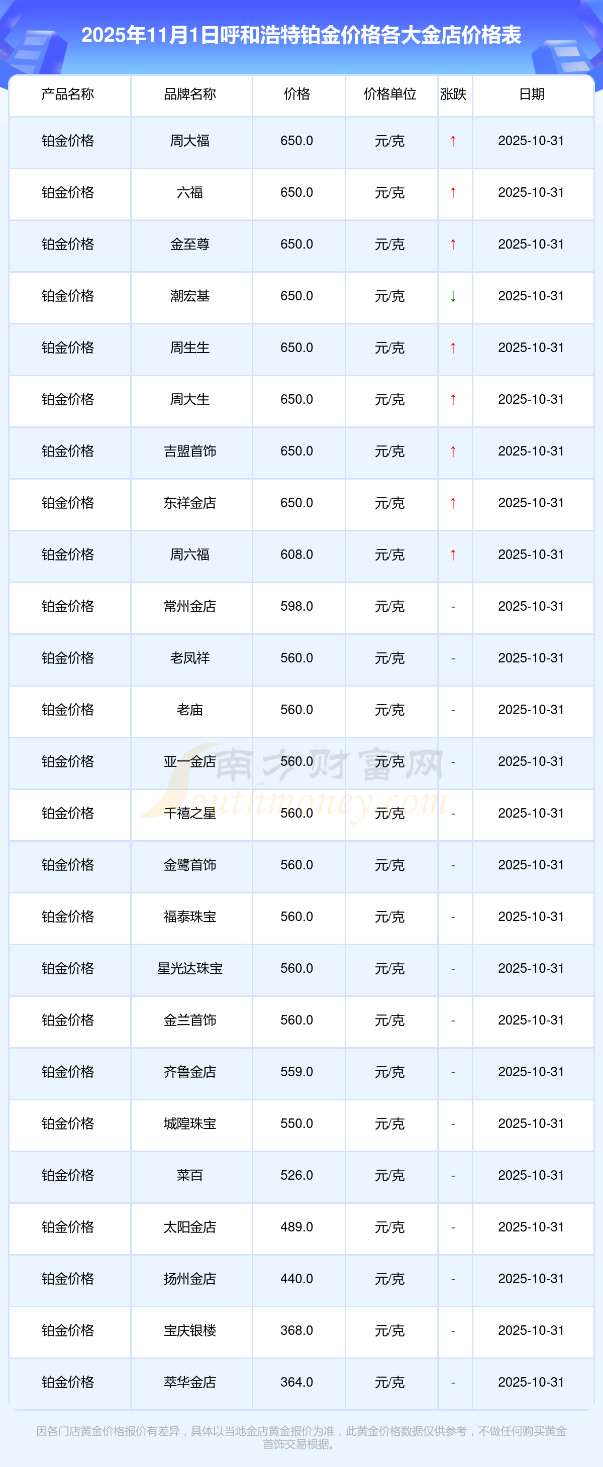 2025年11月1日,呼和浩特周大福、周大福、周大福、周大福、周大福、周大福、周大福、老凤祥、老凤祥、老凤祥、周六福等各大金店品牌铂金价格今日价格行情最新来了:周大福1198.0元/克、周大福650.0元/克、周大福1198.0元/克、周大福44660.0、周大福18640.0、周大福40080.0、周大福1058.0元/克、老凤祥1200.0元/克、老凤祥560.0元/克、老凤祥1200.0元/克、周六福1135.0元/克。