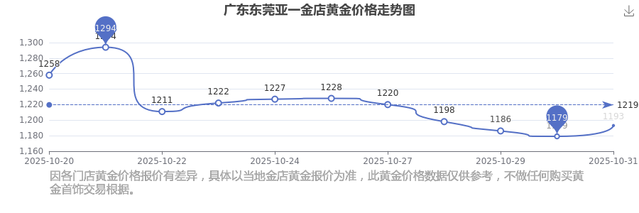 今日(2025年11月1日),广东东莞亚一金店黄金价格的定价为 1193.0元/克。