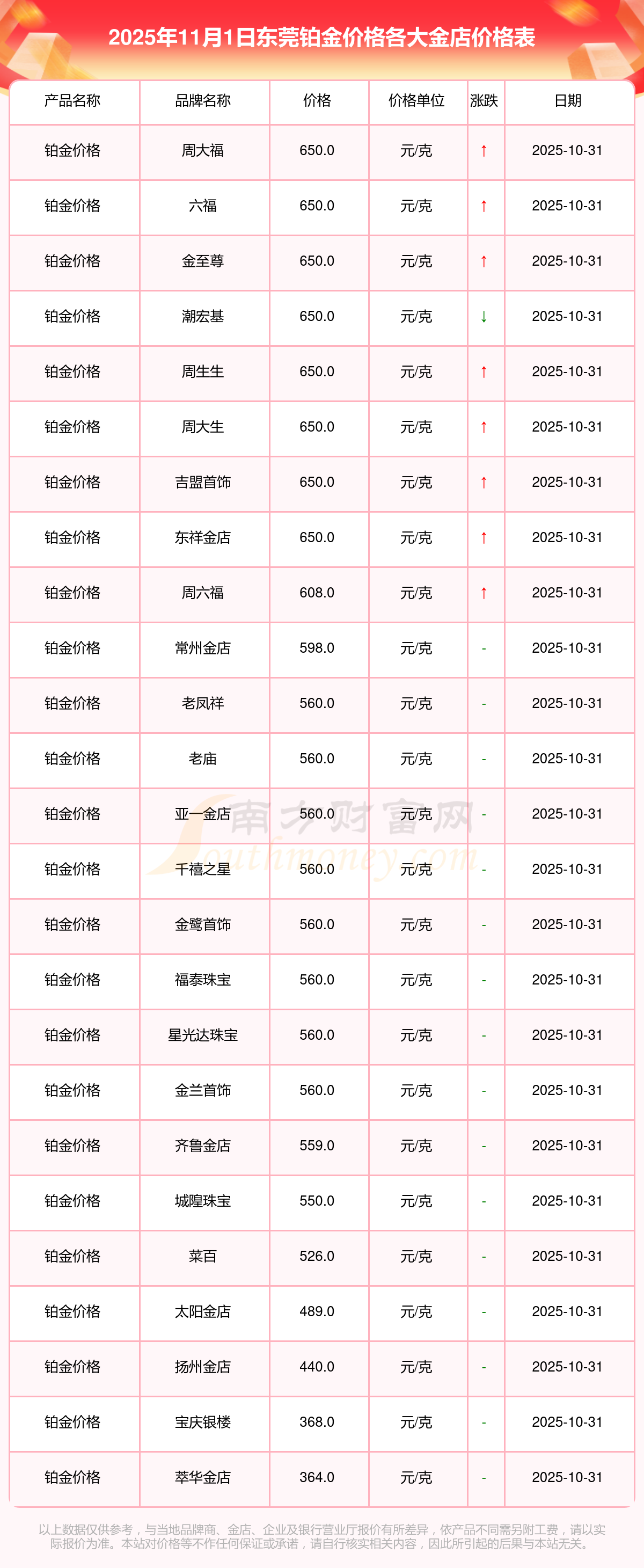 2025年11月1日,东莞周大福、周大福、周大福、周大福、周大福、周大福、周大福、老凤祥、老凤祥、老凤祥、周六福等各大金店品牌铂金价格今日价格如下:周大福1198.0元/克、周大福650.0元/克、周大福1198.0元/克、周大福44660.0、周大福18640.0、周大福40080.0、周大福1058.0元/克、老凤祥1200.0元/克、老凤祥560.0元/克、老凤祥1200.0元/克、周六福1135.0元/克。