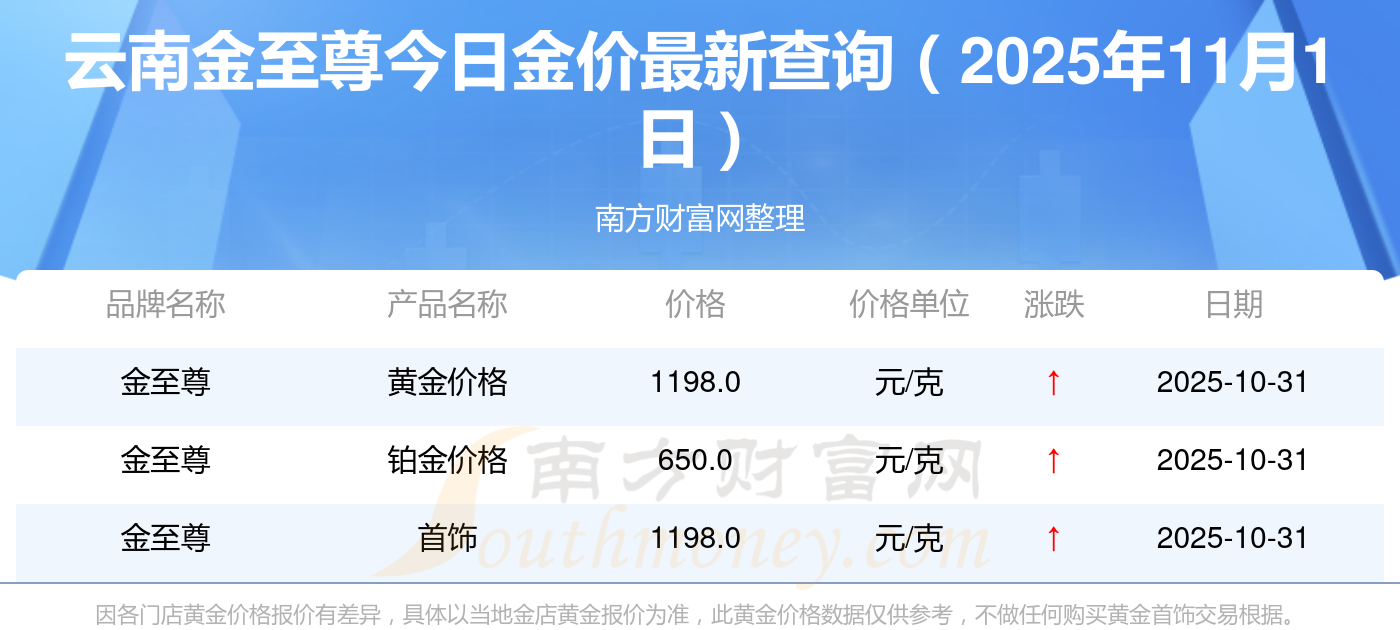 今日黄金价格查询_现在金价黄金一克多少钱,黄金价格是多少钱一克?2025年11月1日云南金至尊金价查询:黄金价格1198.0元/克,铂金价格650.0元/克,饰品金价(内地)1198.0元/克,黄金饰品(香港)44660.0,铂金价格(香港)18640.0,金条价格(香港)40080.0,金条金价(内地)1058.0元/克,黄金价格1200.0元/克,铂金价格560.0元/克,足金价格1200.0元/克,黄金价格1135.0元/克。