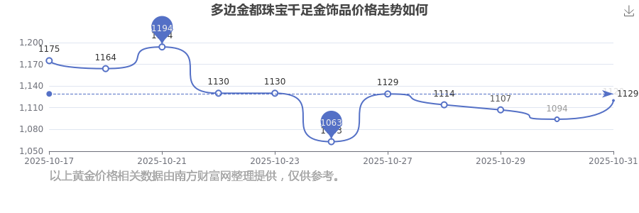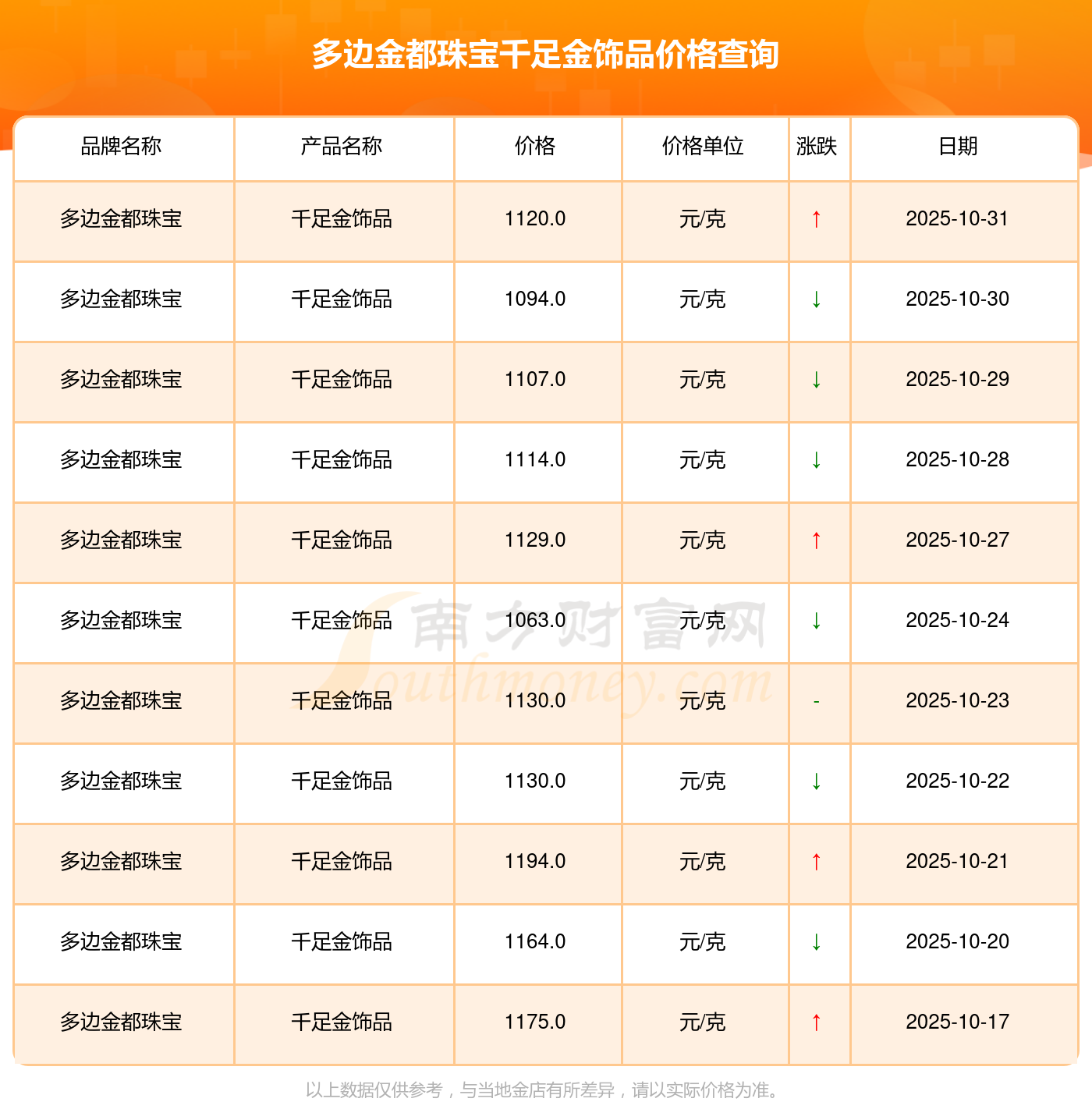 今日多边金都珠宝 千足金饰品价格,最新确定为1120.0元/克。